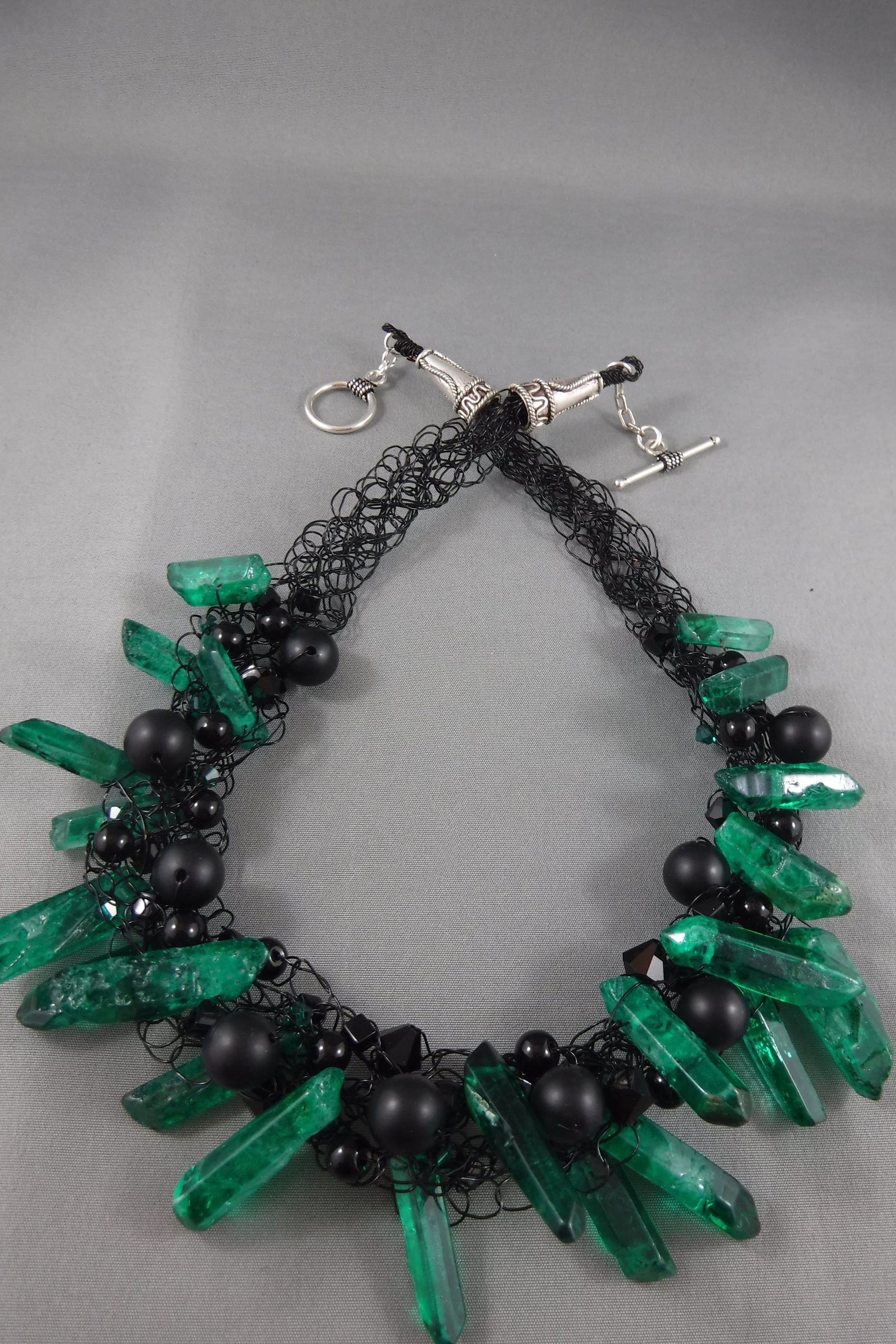 Crocheted with Agate, Onyx and Swarovski pearls and crystals. Bali Sterling Silver end cones and toggle complete this statement necklace (19 3/4" long).
