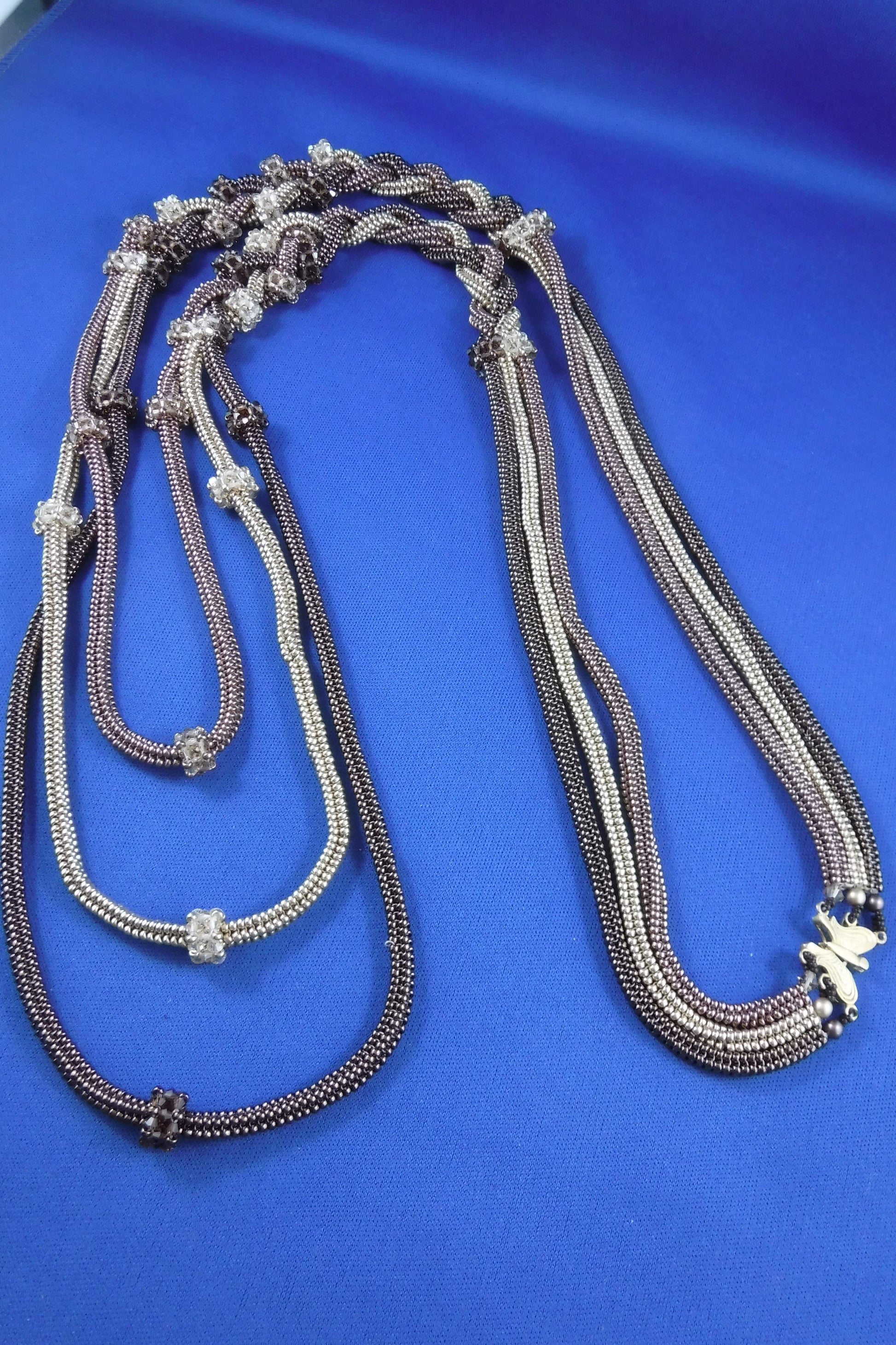 Three beaded ropes, braided and loose, embellished with Swarovski crystals and completed with a gold-Vermeil butterfly clasp (Longest strand- 49"; Shortest- 41 1/2").