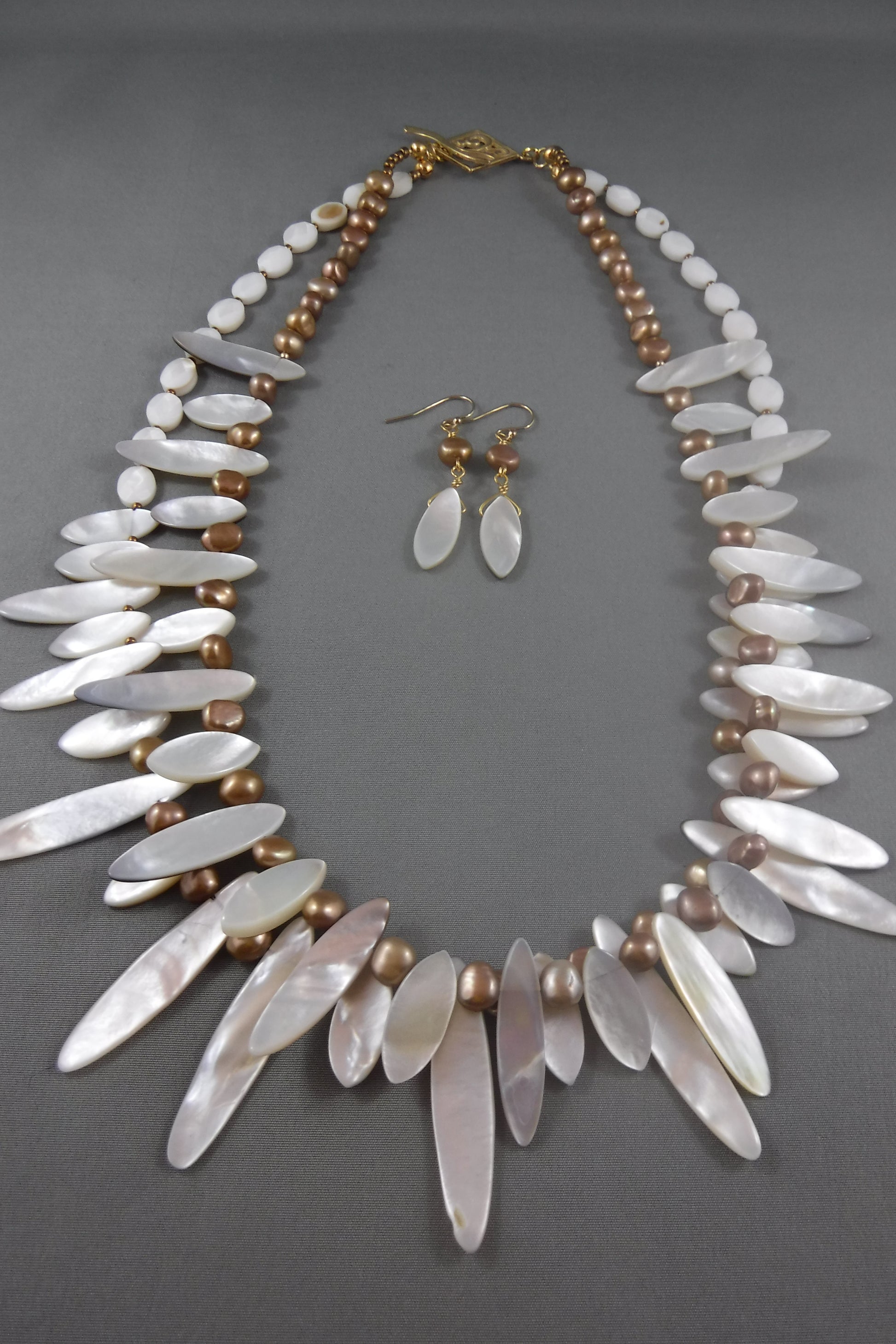 Double strand necklace with Freshwater Pearls, Shell ovals separated by Japanese seed beads, and a gold-plated toggle closure. (22 1/2to 23" long). Matching dangle earrings with gold-filled ear wires included (2" long).