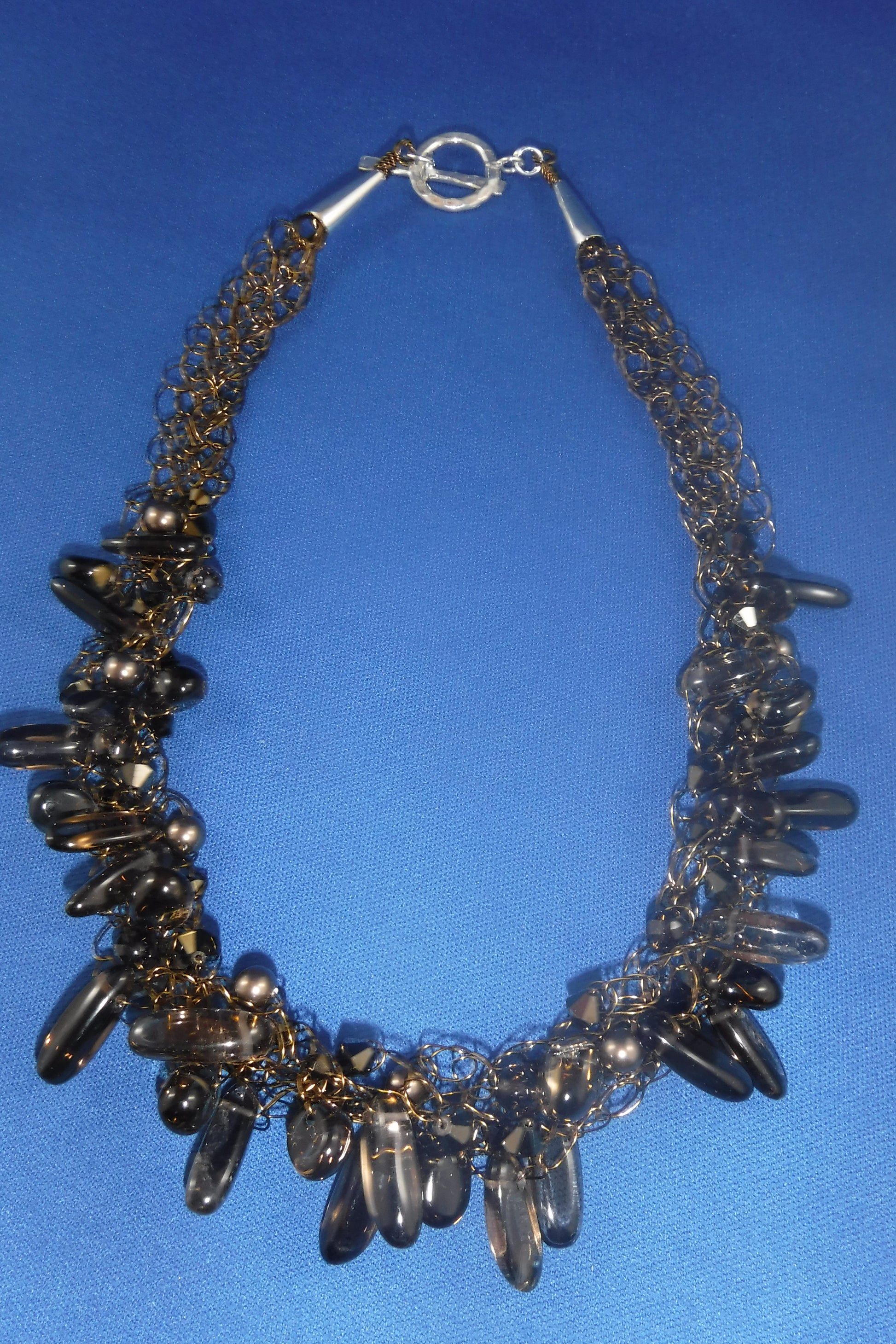Multiple strands of bronze coloured, non-tarnish wire are crocheted with Smoky Quartz, Swarovski Pearls and Crystals to form this unique necklace. It is completed with Sterling Silver end cones and a hammered Sterling Silver toggle. (19" long)