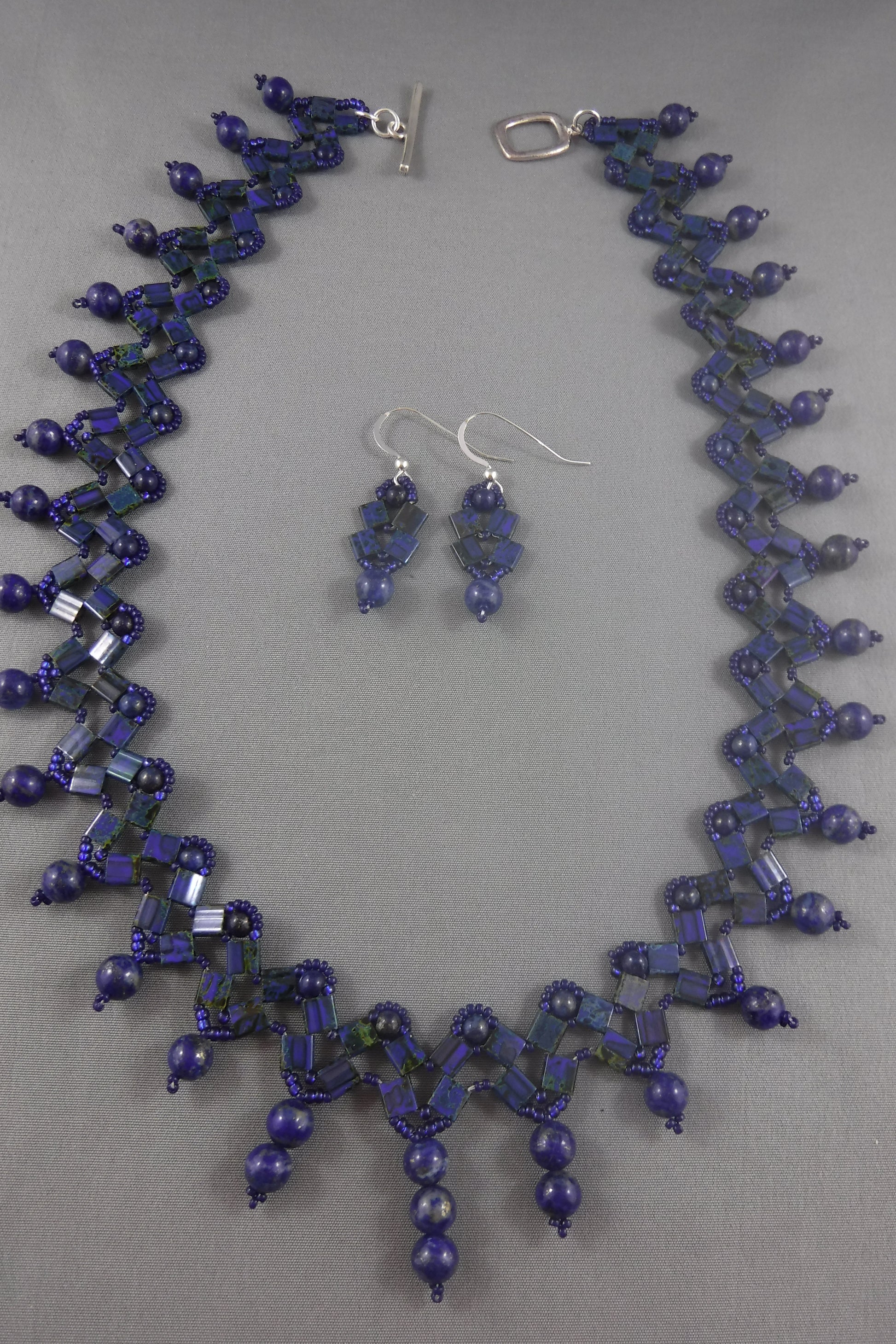 This angular, beaded necklace showcases Lapis beads and beautiful, rectangular Japanese beads, and closes with a rectangular, Sterling Silver toggle. (19 1/2" long). Matching dangle earrings with Sterling Silver ear wires are included (1 1/2" long).