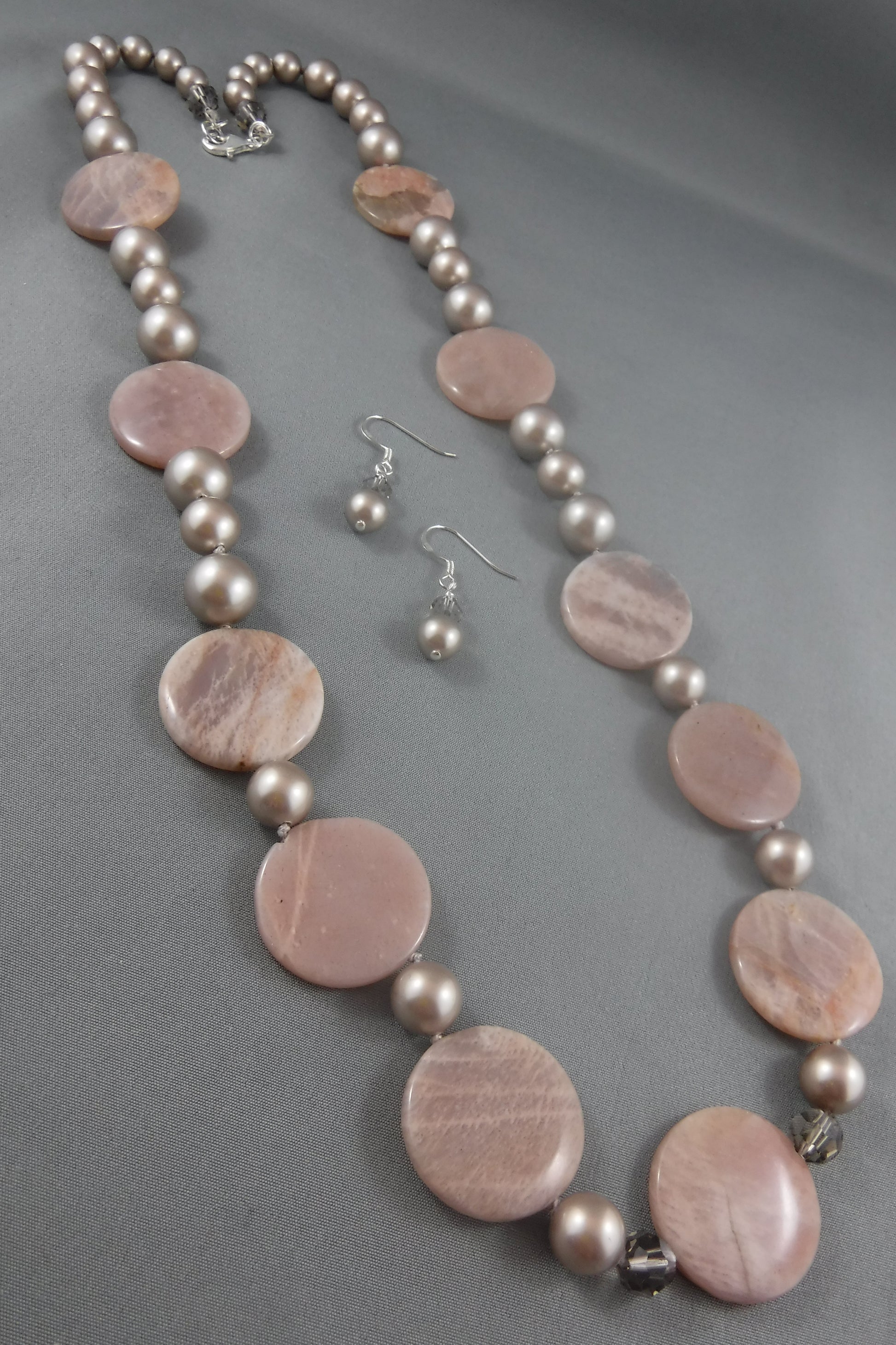 Large soft pink and taupe semi-precious stones (Pink Moonstone) are featured along with platinum coloured Swarovski Pearls, both hand-knotted with silk cord in this on-trend necklace. Swarovski crystals and a Sterling Silver lobster complete the look! ( 30" long). Matching simple dangle earrings with Sterling Silver ear wires are included (1 3/8" long).