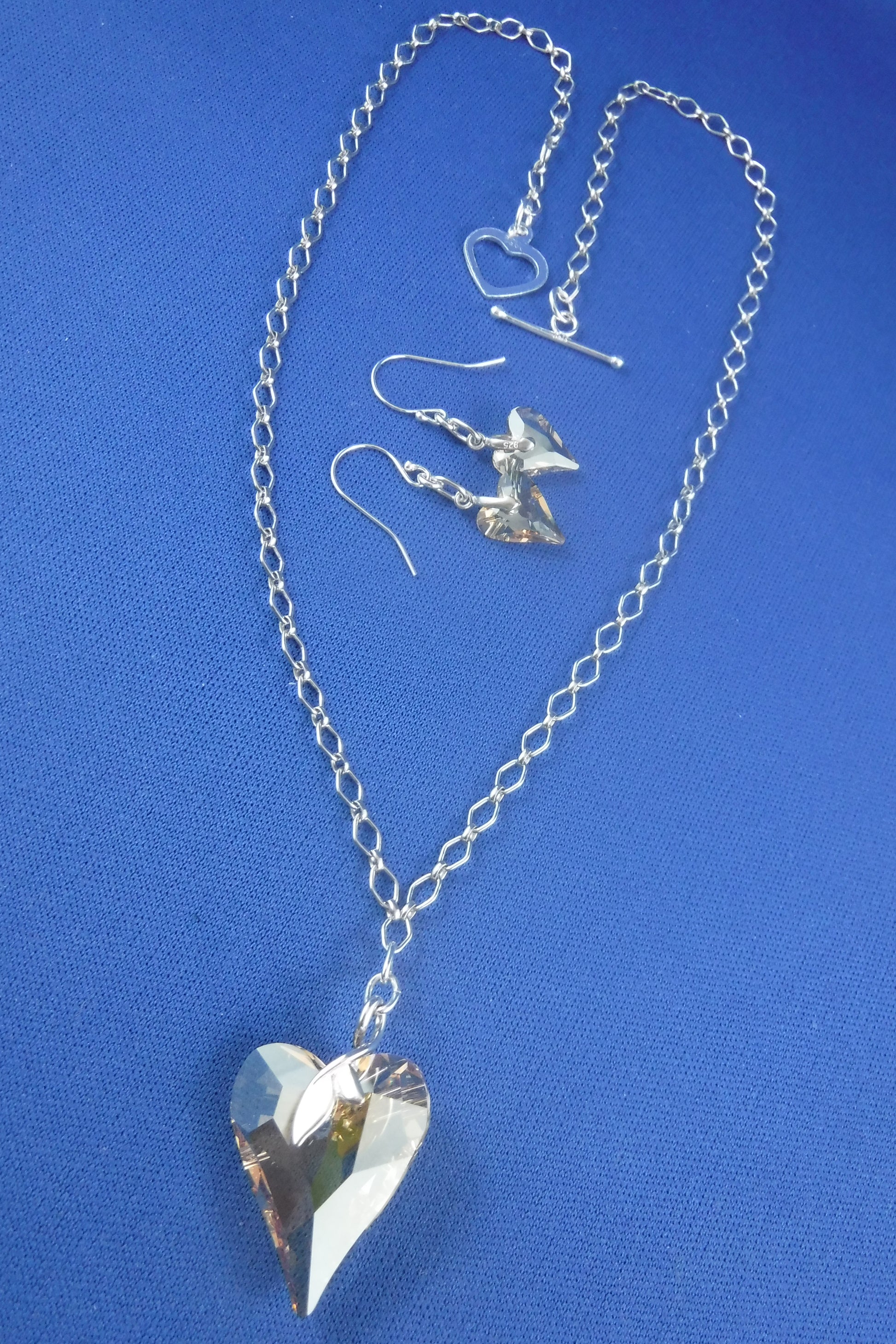 This necklace features a beautiful Swarovski heart, on an angular Sterling Silver chain. Sterling Silver details, such as the leaf-shaped bail holding the large crystal in place and the heart-shaped toggle, enhance this necklace. ( 19 1/2" long). Matching earrings with Sterling Silver chain and ear wires are included (1 1/4" long)