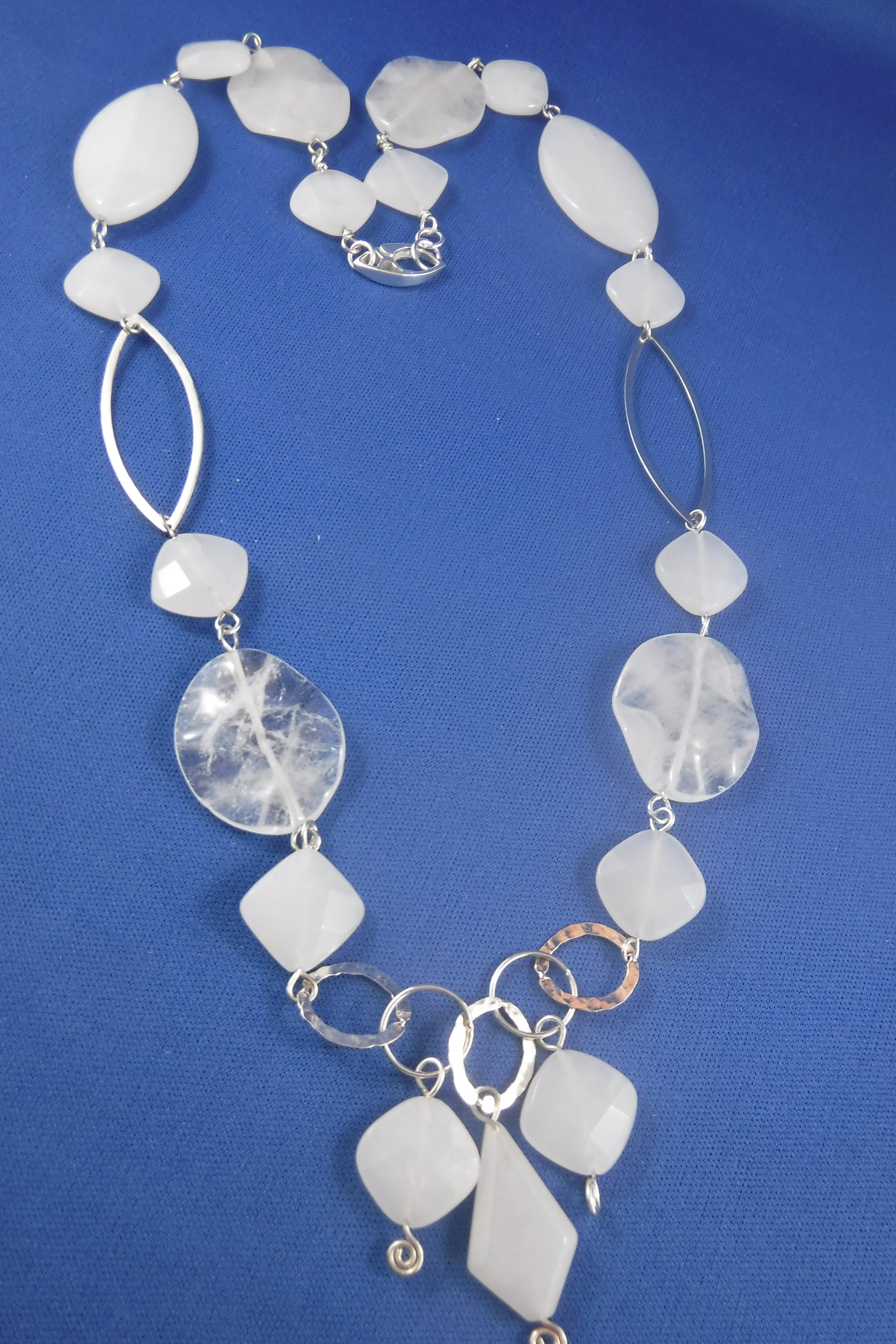 White Jade in a variety of shapes and sizes, Quartz and Sterling Silver marquise shapes all add up to a unique necklace, closed with an interesting Sterling Silver, marquise-shaped lobster. (26 1/2" long).