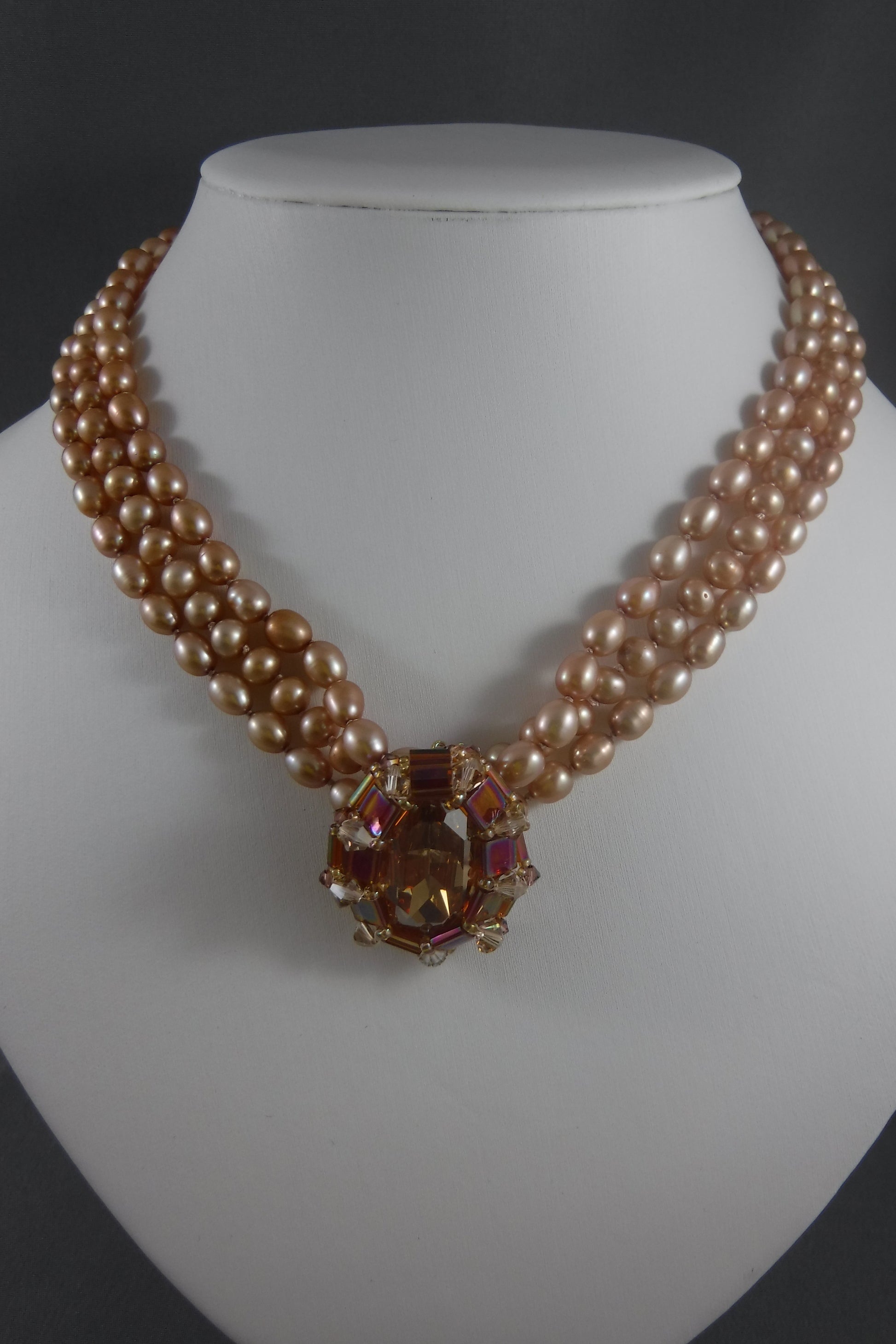 This elegant necklace is a triple-strand choker, with hand knotted Freshwater Pearls in gold tones and a removable, oval Swarovski crystal that has been bezelled with Japanese beads and tiny Swarovski crystals to embellish the centre. Gold-filled ends and lobster closure completes this unique piece. The Pearl choker is 3/4" wide, and 16 3/4" long (although slightly adjustable if requested). The centre crystal is 1 1/8" tall.