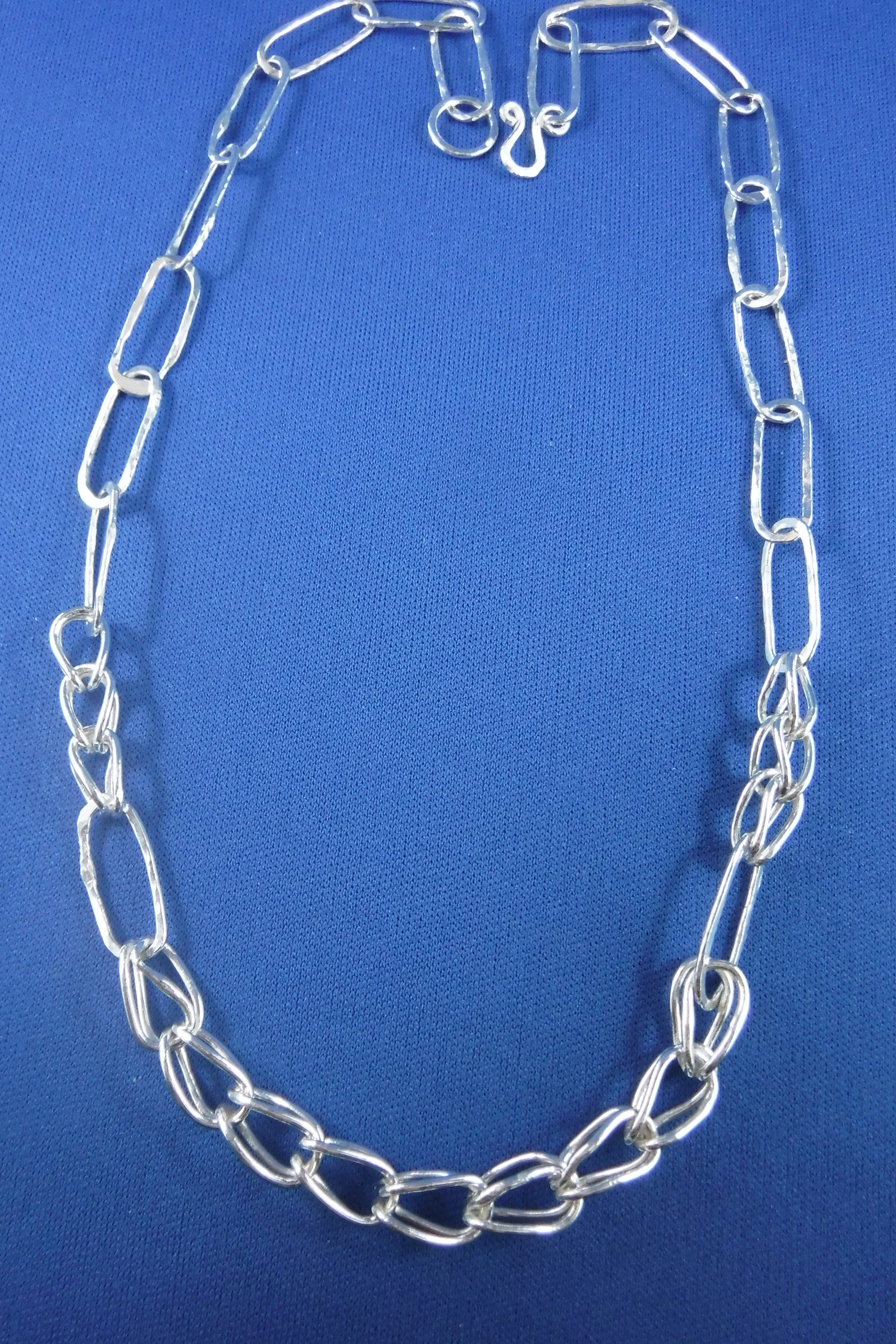This unique design is created with hand-shaped Fine Silver. Large paperclip-shaped links connect with double links, for additional interest and depth. A hand-shaped, Fine Silver hook completes this 20 1/2" long necklace.