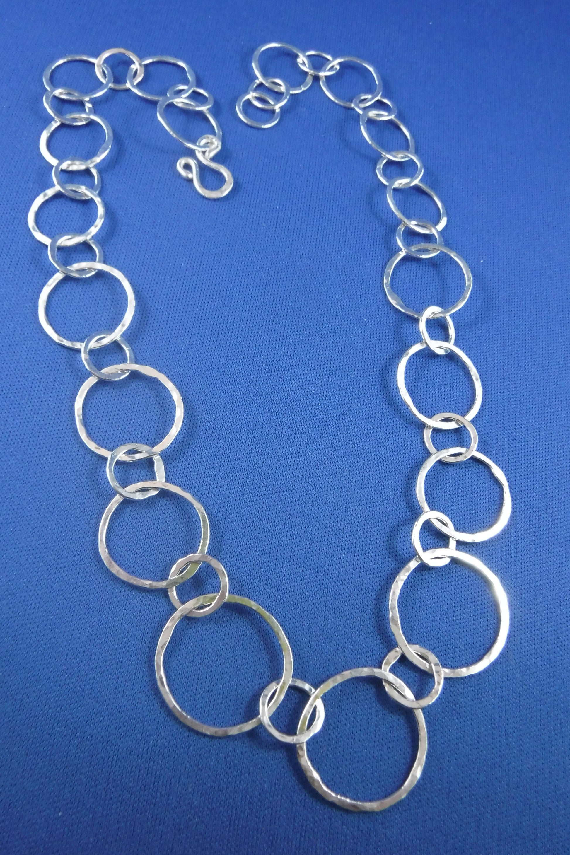 Fine Silver is hand shaped to create three sizes of loops (1/2". 3/4" and 1") to form this chain necklace that you will find very versatile! It has a hammered finish and a hand-shaped Fine Silver hook closure. (19 1/4" long)
