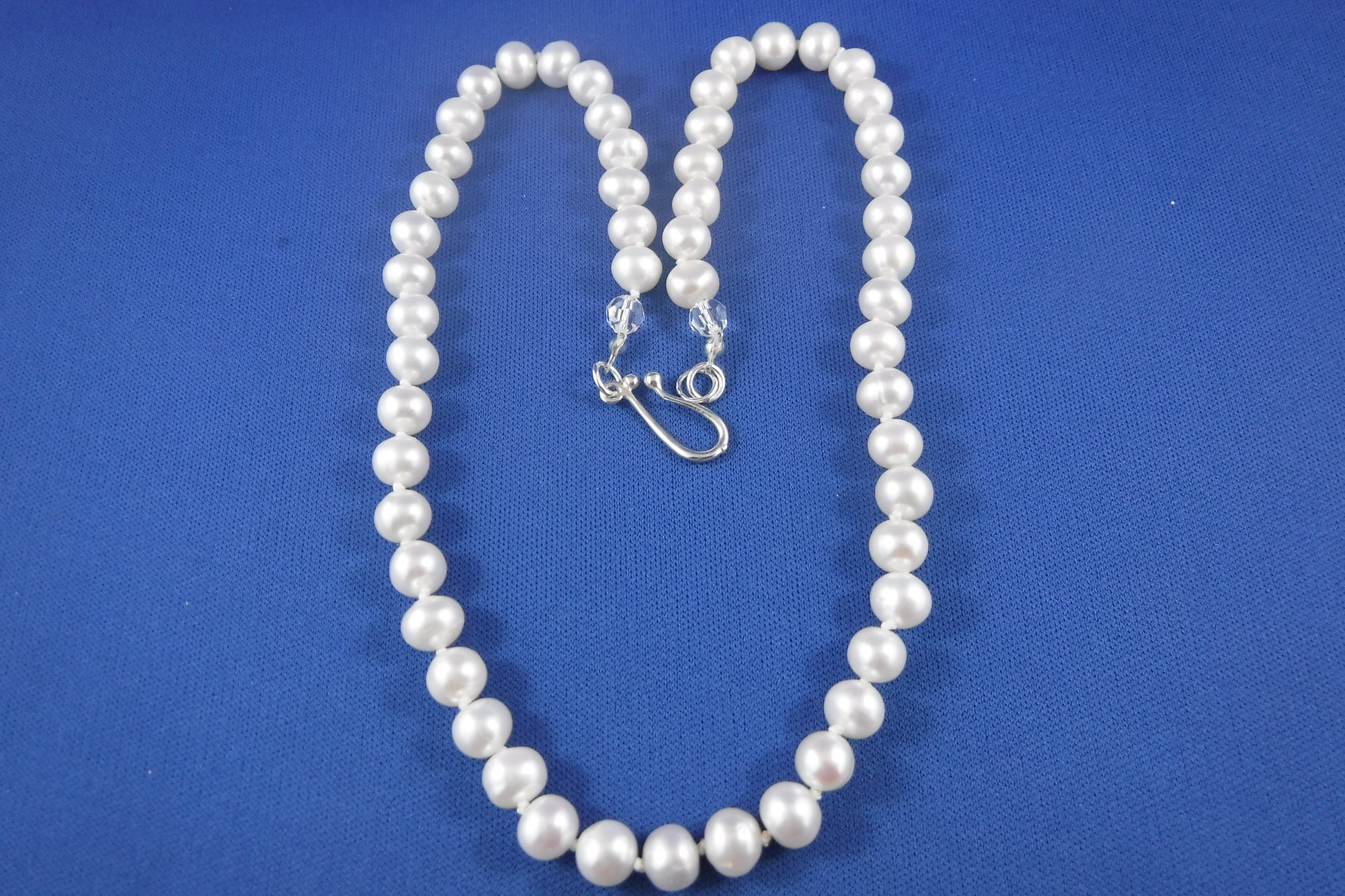 Simple elegance is a glossy strand of white, hand knotted Freshwater Pearls! This strand is accented with Swarovski crystals on either end and a Sterling Silver hook closure. It is 20" long.