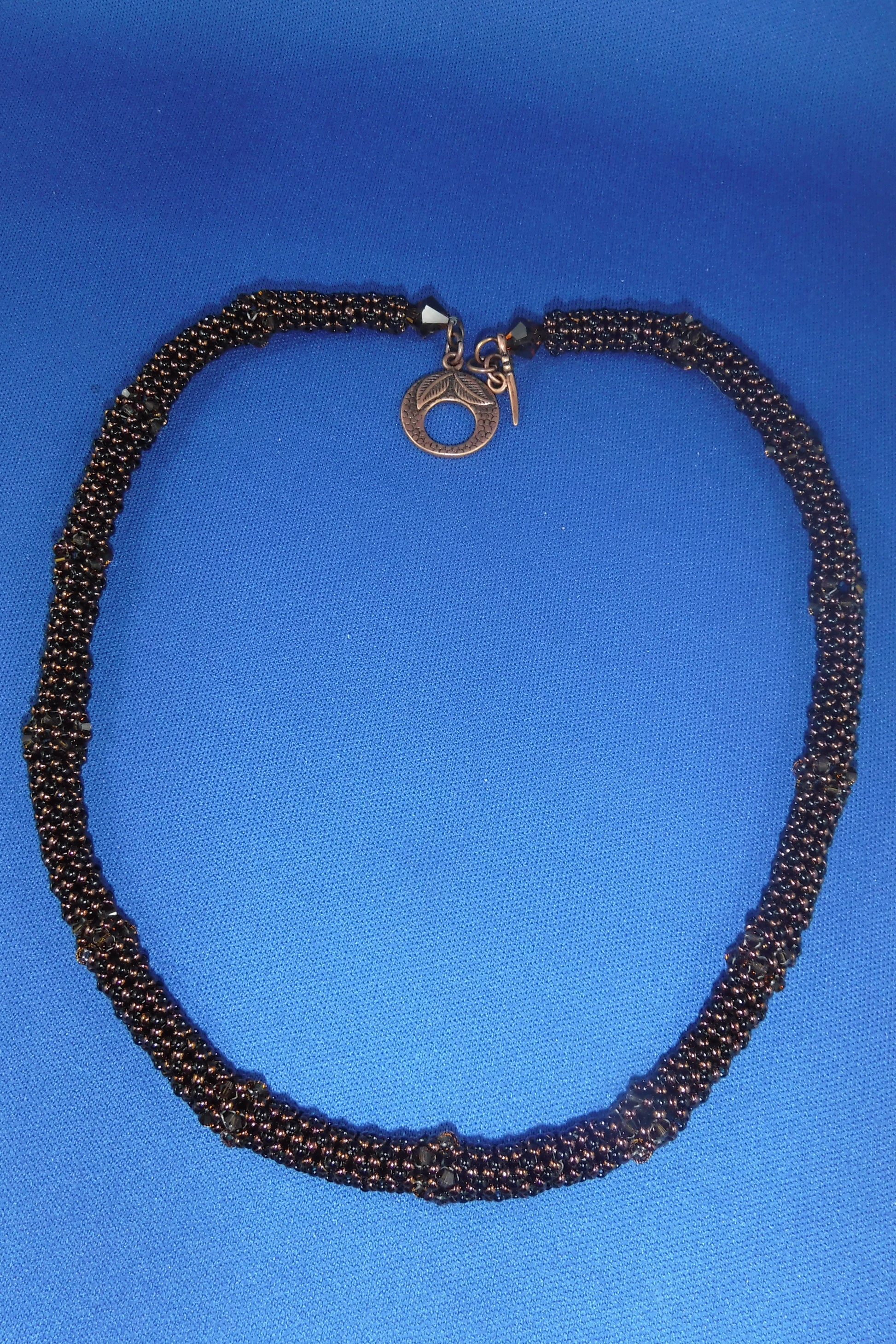 This beaded rope necklace is embellished with tiny Swarovski crystals and completed with larger Swarovski crystals and an antique Copper-plated toggle closure, which is Nickel-free. It is dark bronze, 20 1/2" long and 1/4" wide.