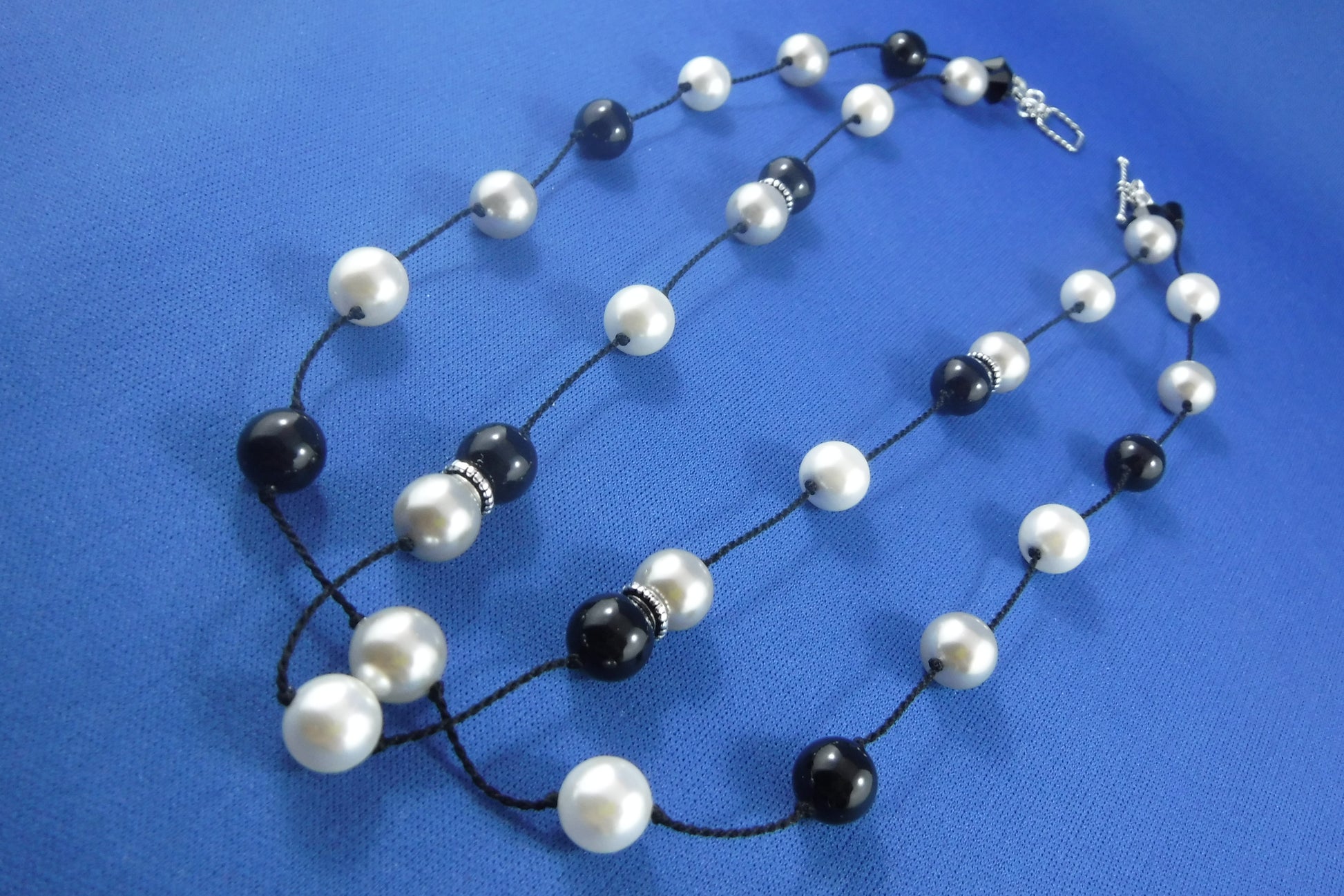 This double-strand, delicate necklace presents Shell Pearls in white, silver and black, hand knotted on Silk Cord. Sterling Silver dividers and an end, square, twisted toggle add detail, while Swarovski crystals embellish the ends. The strands are approximately 18 3/4 and 21 1/2" long.