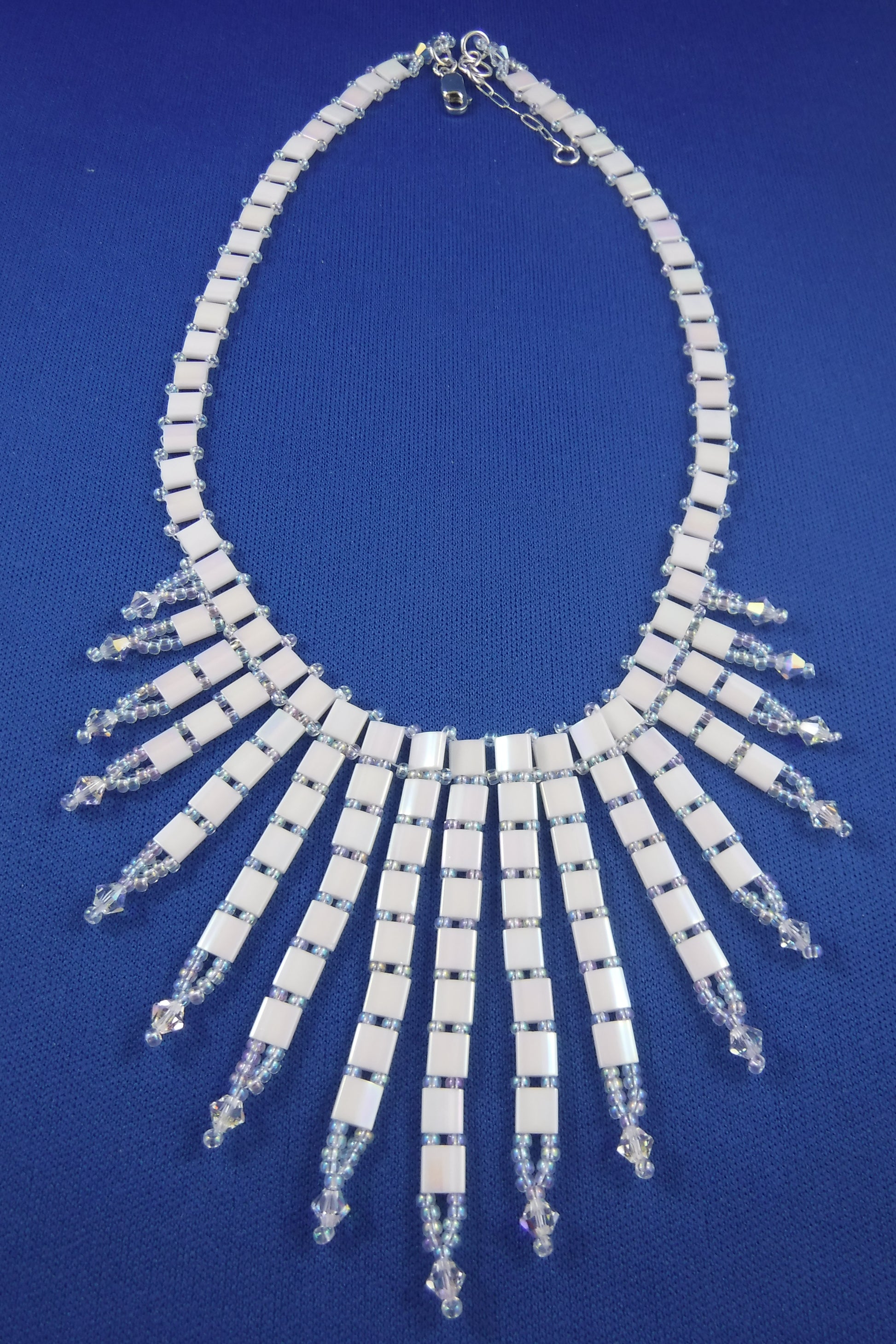 This beaded necklace is ultra light to wear! It is created with Japanese Tila beads, seed beads and Swarovski crystals, and closes with a Sterling Silver elongated lobster closure. It is glossy white with a slight "Aurora Borealis" effect. (16 1/4" long- An additional 1 1/4" extension is possible if requested on order).