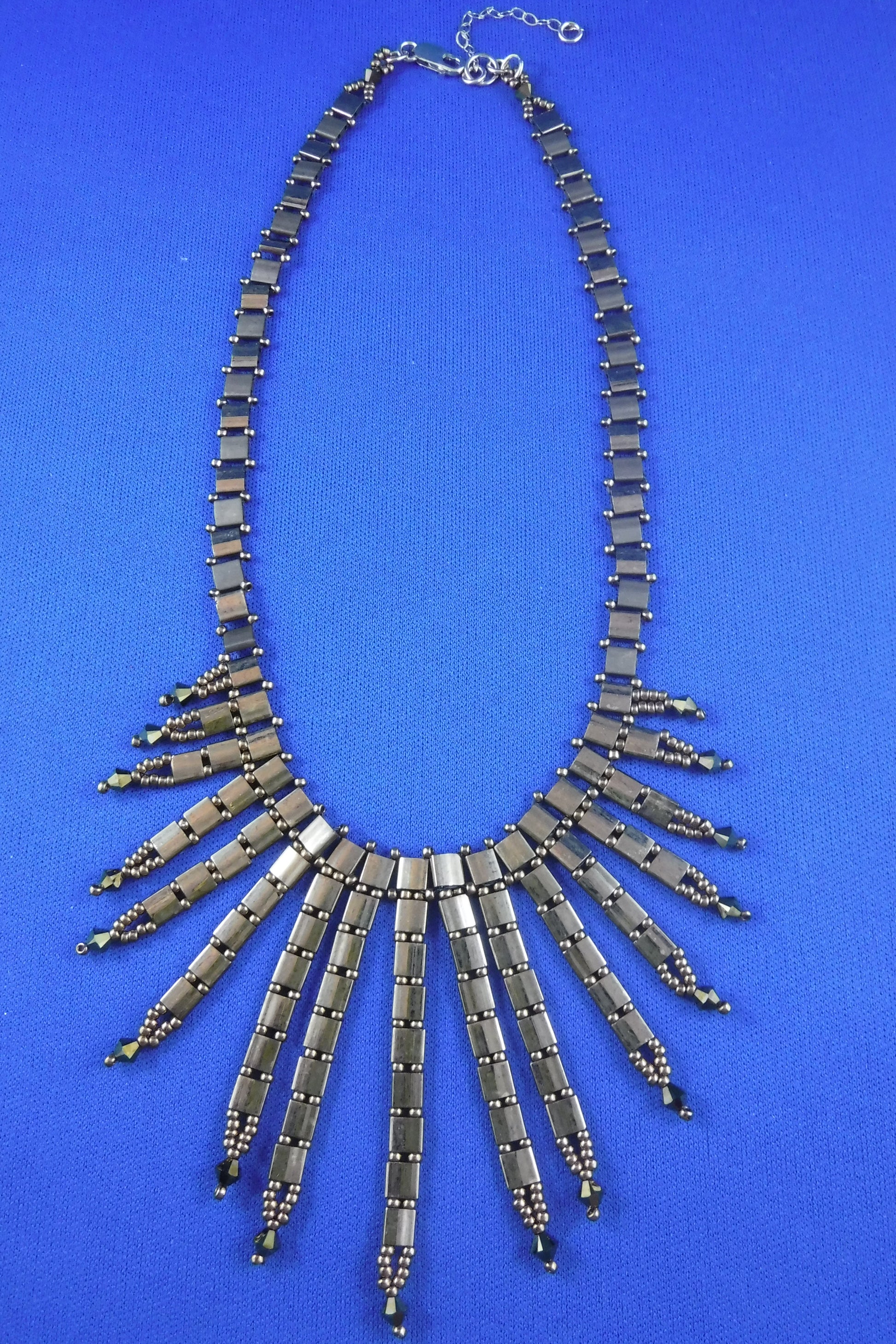 This beaded necklace is ultra light to wear! It is created with glossy, bronze Japanese Tila beads, seed beads and Swarovski crystals. The closure is an elongated Gold-filled lobster, and length can be extended up to 2" with Gold-filled chain if requested with your order. It is 16" long, as is.