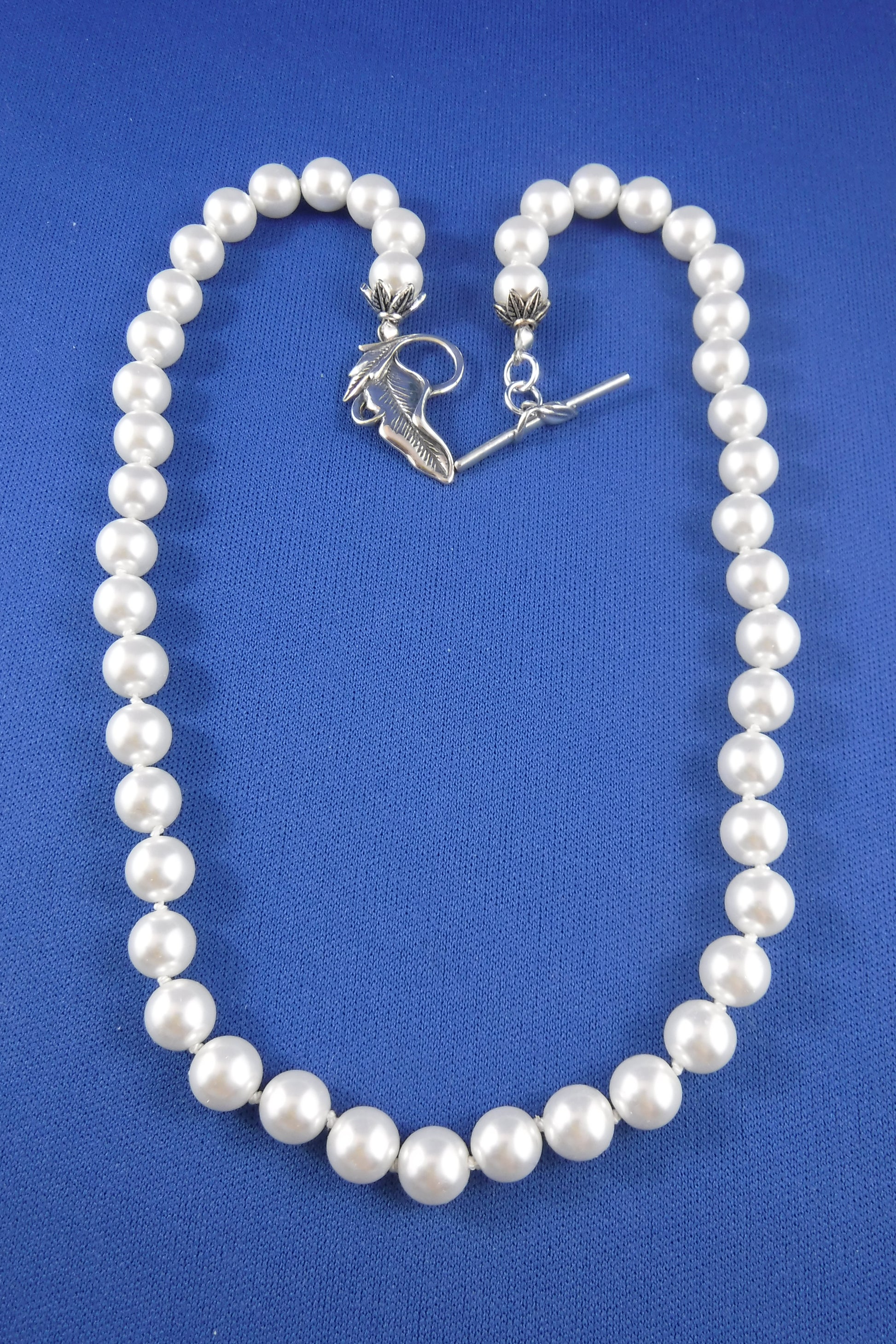 8 mm. glossy, white, Shell Pearls are hand- knotted with silk cord and embellished with Sterling Silver end caps and leaf-shaped toggle closure in this simple but elegant 20" necklace.
