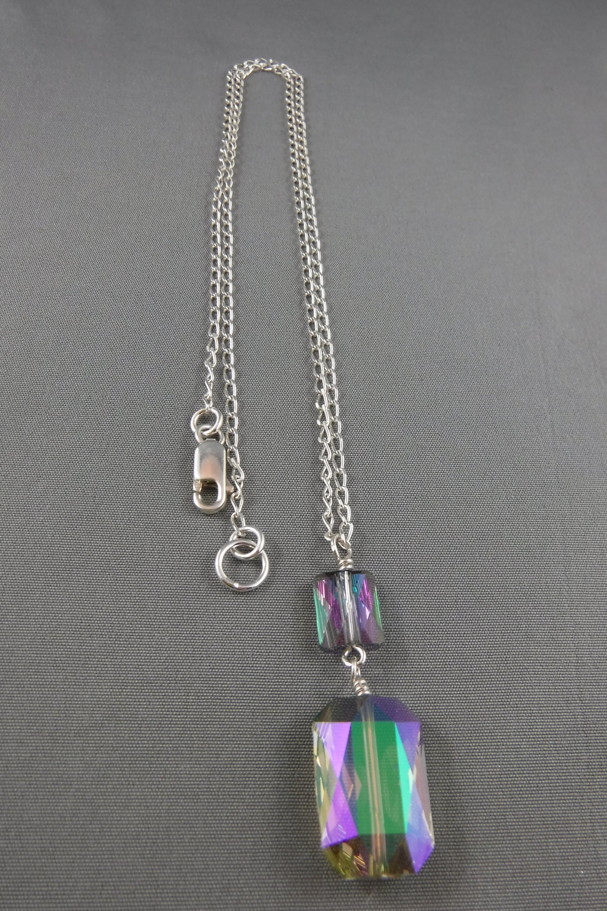 Faceted Swarovski crystal rectangles are featured in this 20" pendant necklace with a Sterling Silver chain and elongated lobster closure. These crystals reflect blues, greens and purple shades.