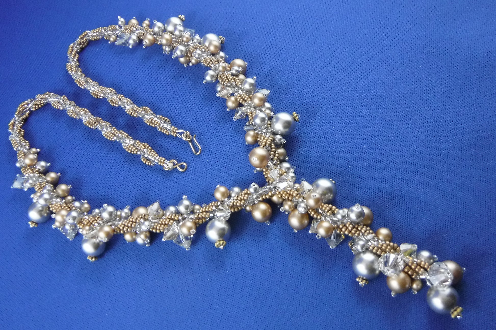 This stunning soft gold and silver toned necklace is a hand beaded rope of Japanese seed beads with Swarovski Pearl and Crystal embellishment. It closes with a Gold-filled hook and eye closure. It is 23 1/2" long, with a 3" long middle dangle.
