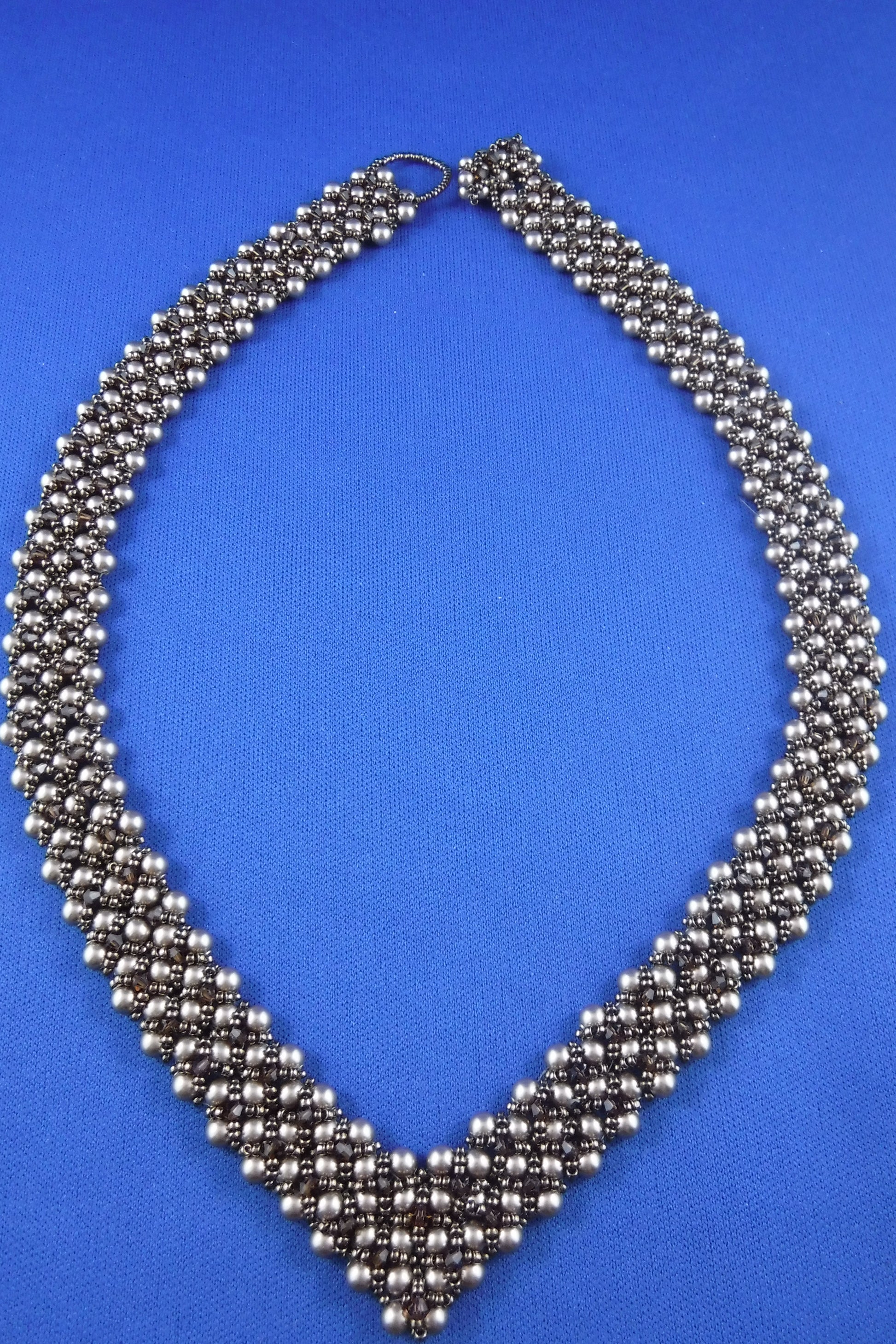 This beautiful V-shaped necklace is created with Swarovski Pearls and Crystals, and Japanese seed beads. It is metal free, as the closure is also hand beaded! The pearls are light bronze, and the 3 mm. crystals placed between them are "Smokey Topaz"- a brown shade. (19 1/2" long)