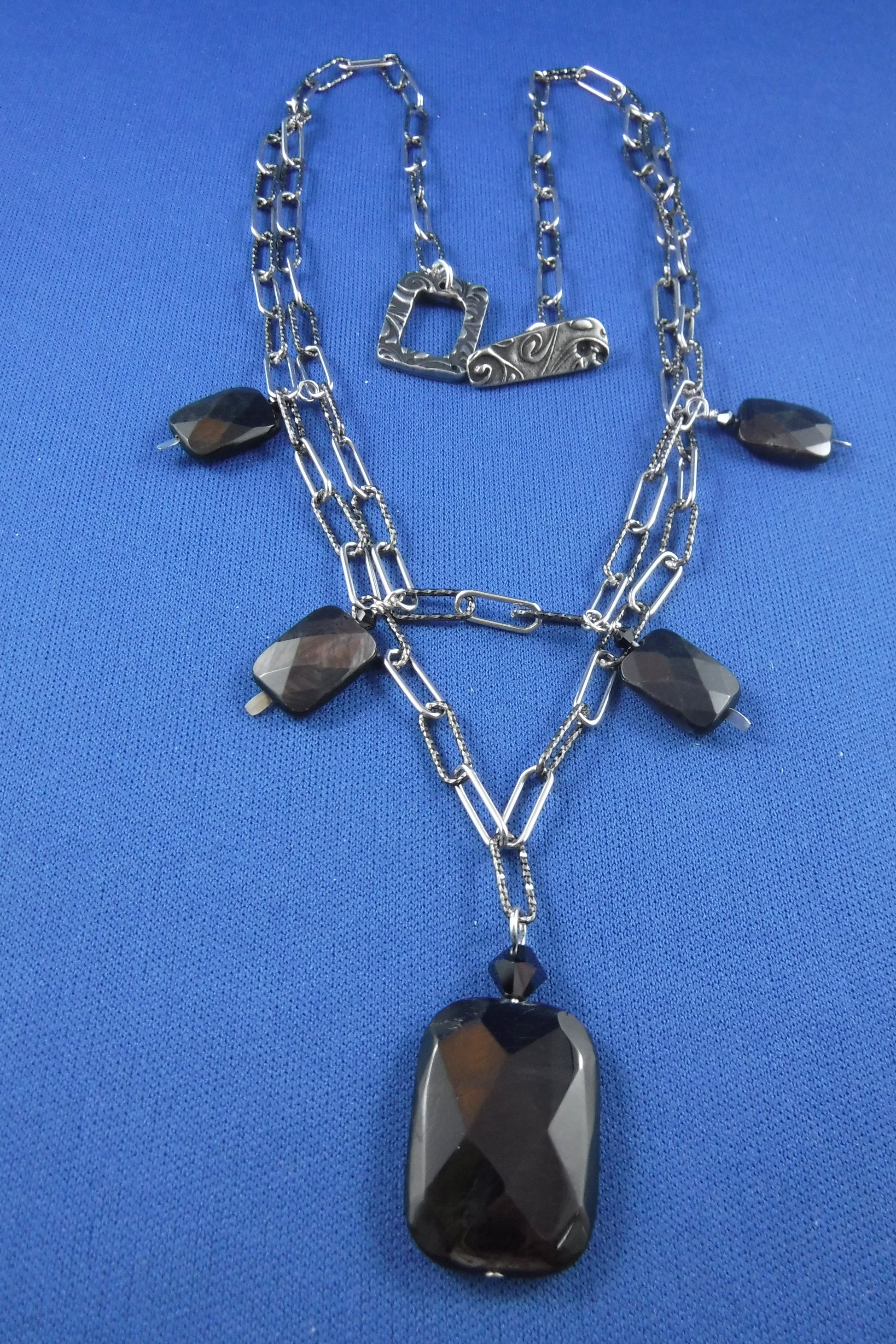 This necklace is created with two-toned, sturdy Sterling Silver paper-clip shaped chain. Each link is one centimeter long. It is embellished with faceted Hypersthene stones and Swarovski crystals. An antique Pewter, rectangular toggle completes this unique look!