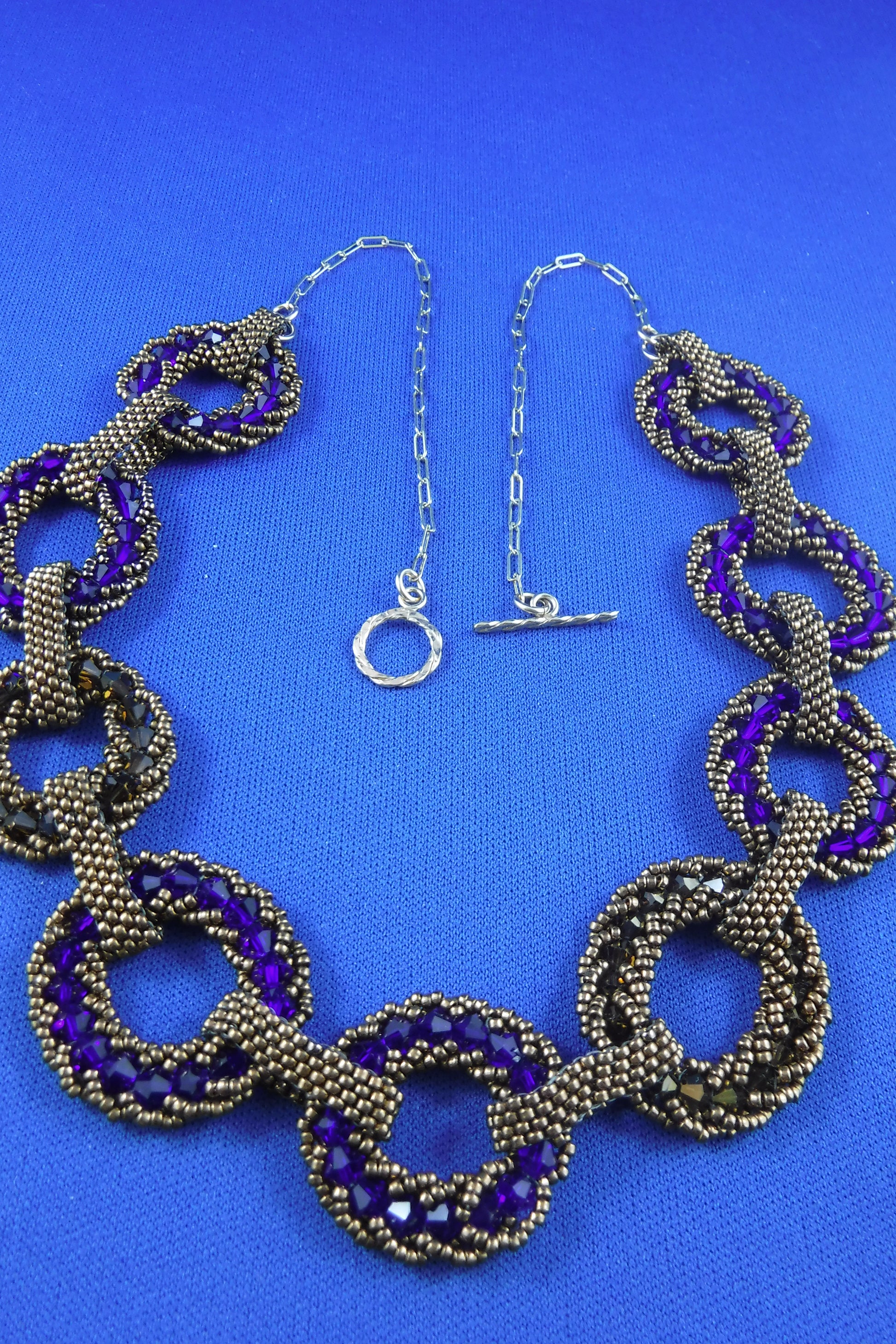 This unusual beaded necklace is crated with tiny Japanese seed beads encasing two shades of Swarovski crystals - a brilliant royal blue and deep gold/topaz. The series of loops (larger and smaller )are completed with gold-filled chain and toggle closure. It is 22 1/2" long.
