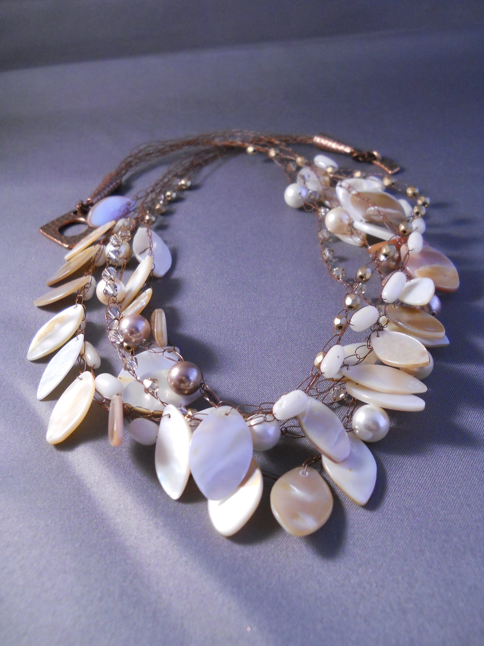 Crocheted loose multi-strand with very fine brown wire, cream and brown shell (22")