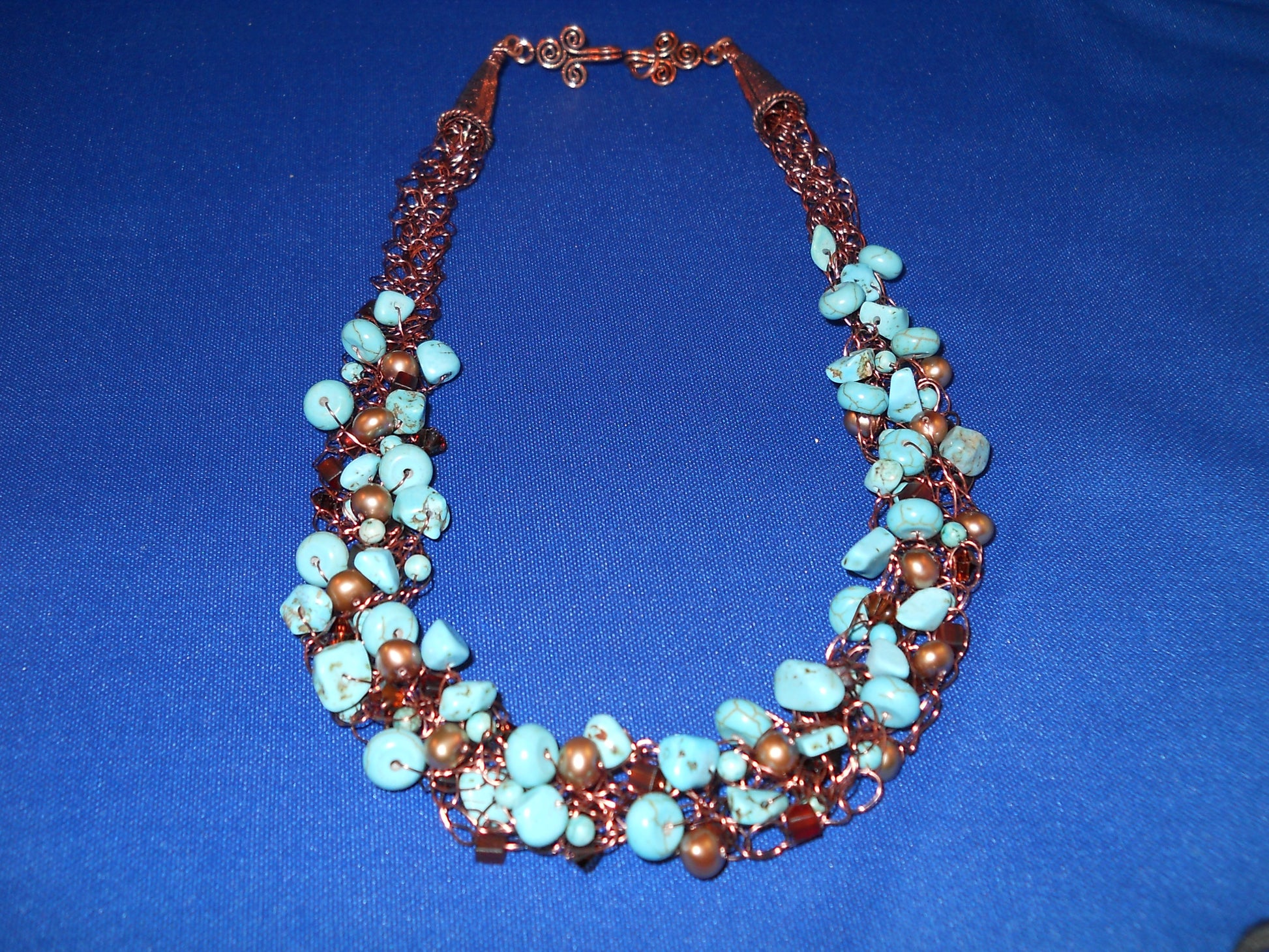Copper wire crocheted necklace with copper cones and scroll closure, turquoise stones, copper brown freshwater pearls and Swarovski crystals ( 19" )