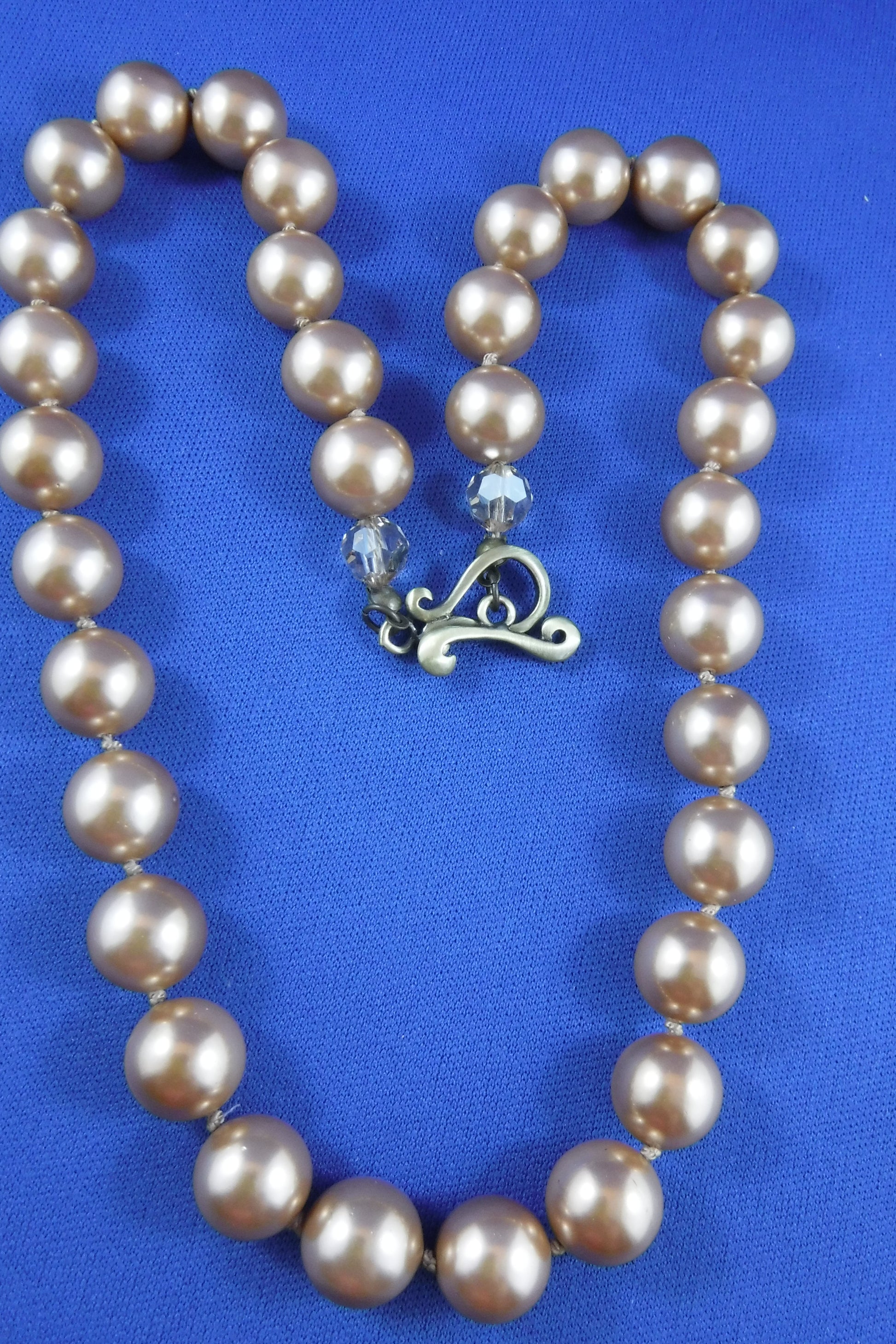 Hand knotted 10mm shell pearls, SW crystal ends and antique brass teardrop toggle (20 ½ inches)