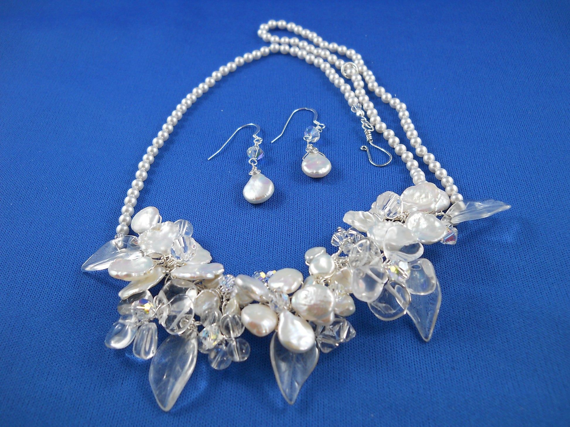 Large white Keshi pearl and quartz crystal flower cluster necklace with 4mm SW pearl strands and quartz crystal leaves and hand made hook (20"). Bonus: Matching earrings with Sterling Silver earwires included (2" long).