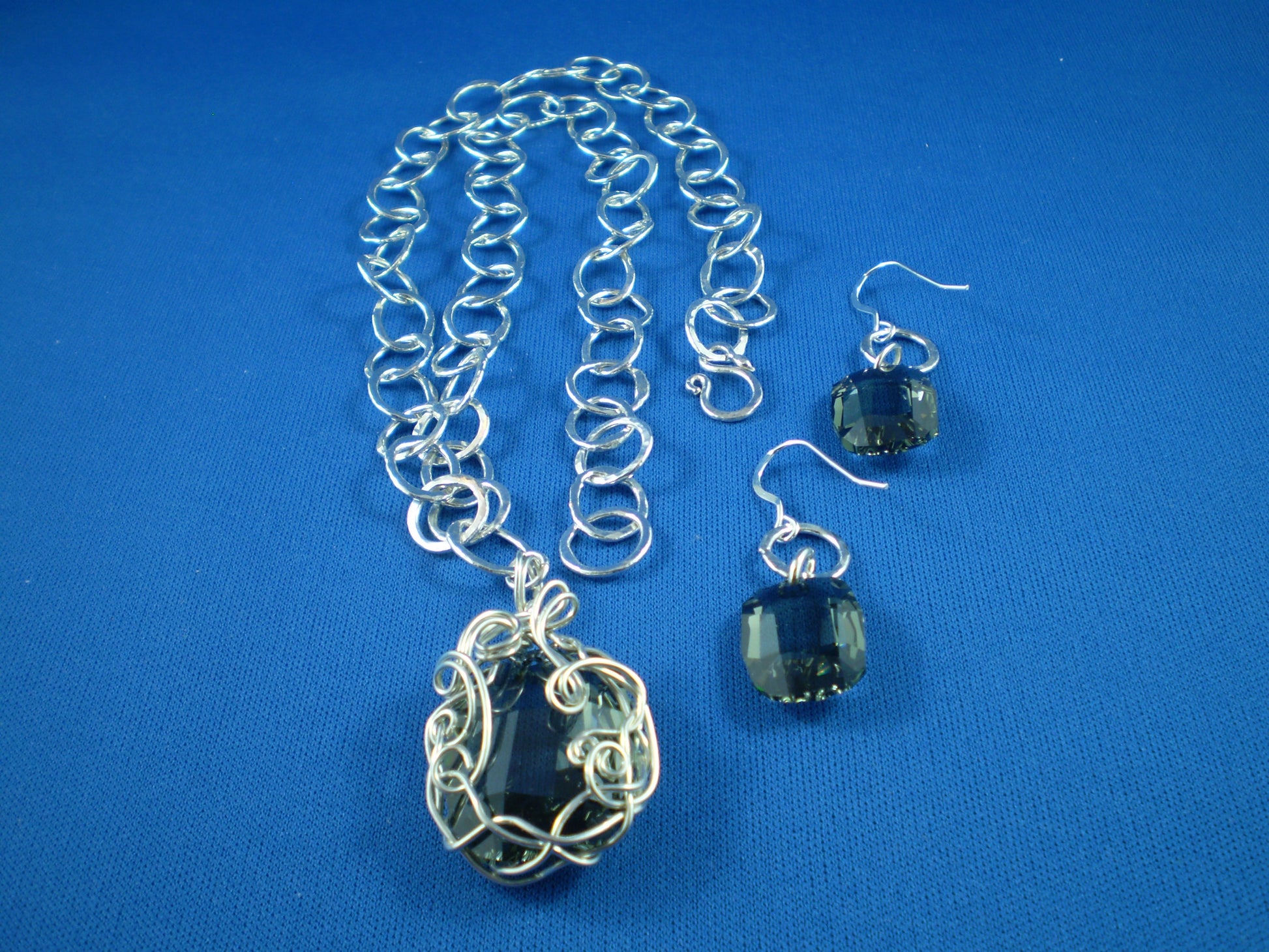Fine Silver handmade chain and hook; Swarovski crystal pendant wrapped in silver (22"). Matching crystal earrings with Sterling Silver earwires included (1 3/4" long).