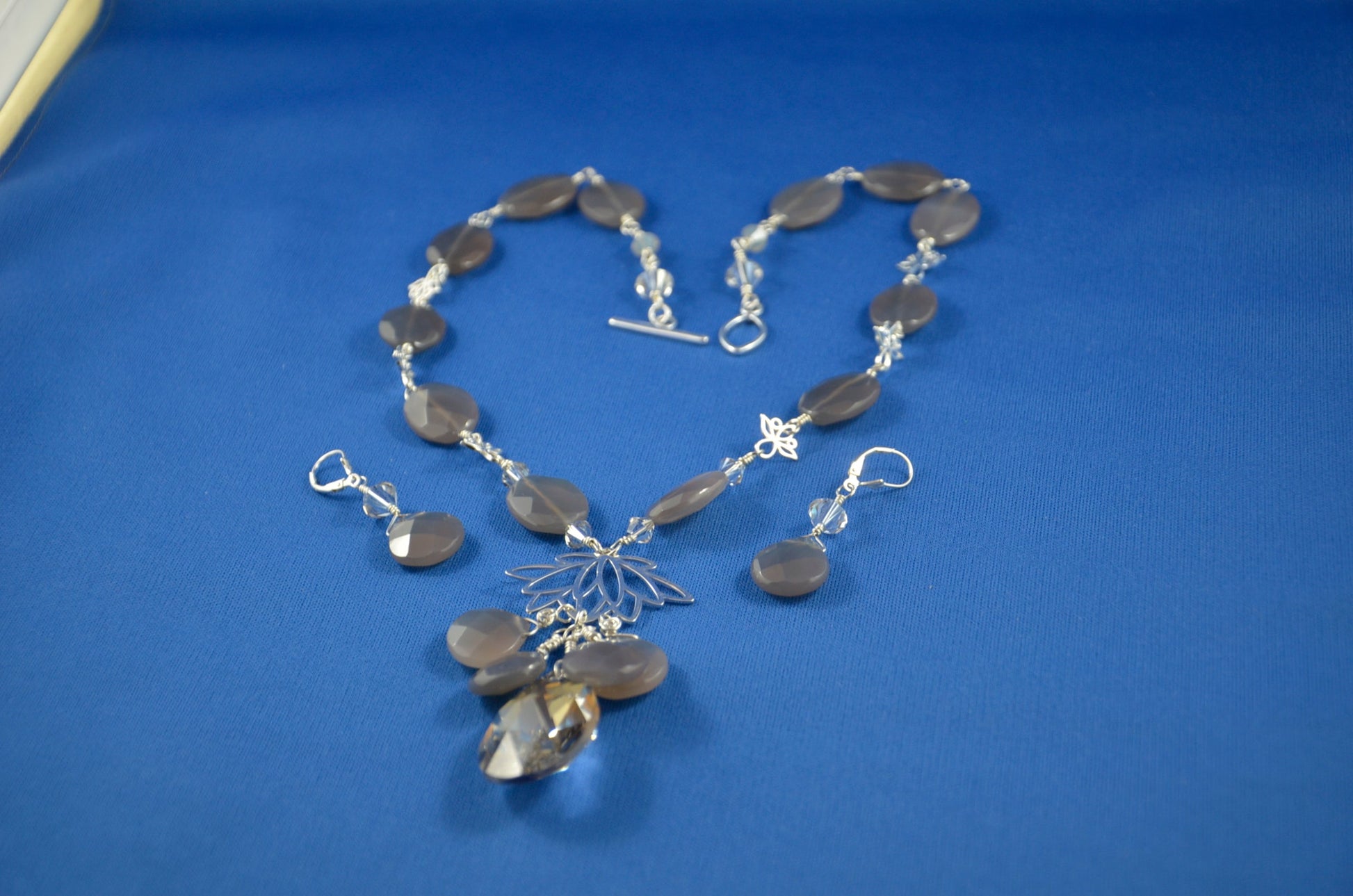 Sterling silver lotus necklace with faceted grey Agate and large Swarovski crystal pendant with crystal dangles. Sterling toggle (21") Matching Agate earring with Sterling Silver French earwires included (1 3/4" long).