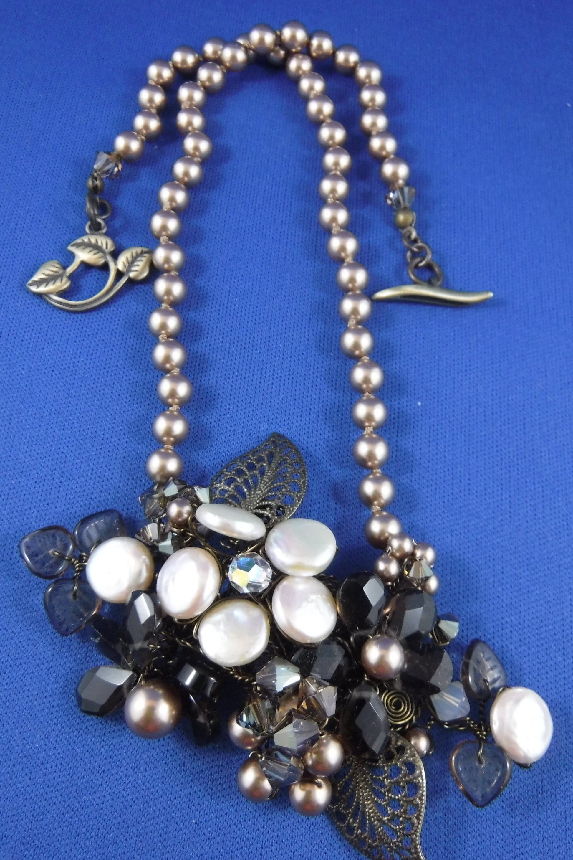 Flower cluster necklace with cream-coloured coin pearls, Swarovski pearls and crystals ad Smokey Quartz. Antique brass filagree leaves, end cones and toggle (19").