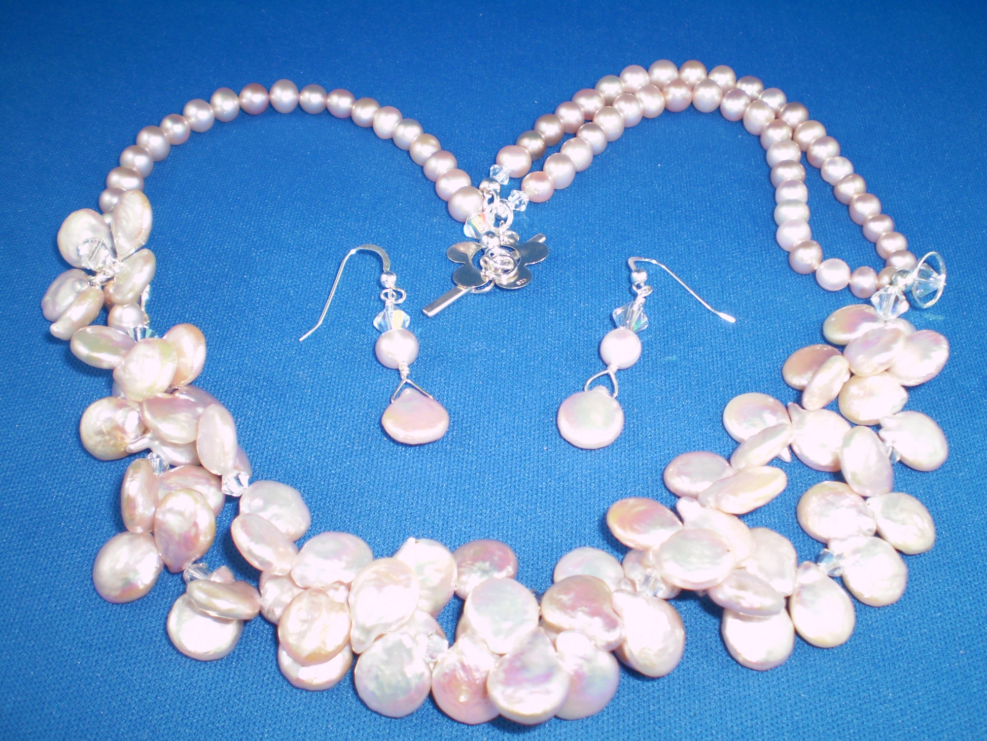 Freshwater "coin" pearls with Swarovski crystals and sterling silver toggle (21"). Bonus:Matching earrings with necklace included (2" long).