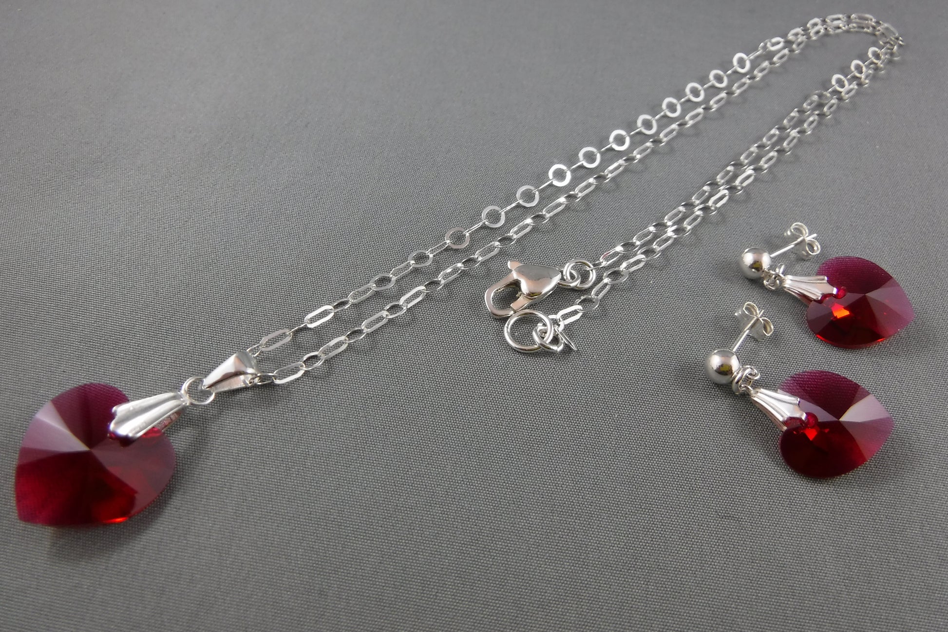Scarlet red Swarovski hearts dangle from with Sterling Silver bails, chain and 5mm ball studs in this lovely necklace and earring set. The necklace closes with a heart-shaped, Sterling Silver lobster too! It is 21 1/2" long, as is, but could be shortened on request.