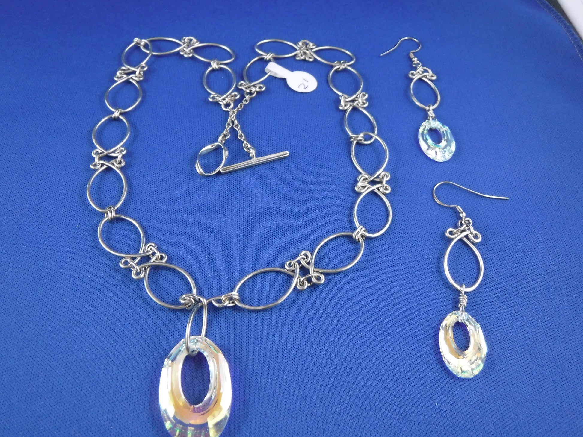 Sterling silver oval loops with Swarovski pendant (18 to 19") Matching earrings with Sterling Silver earwires included (3" long)