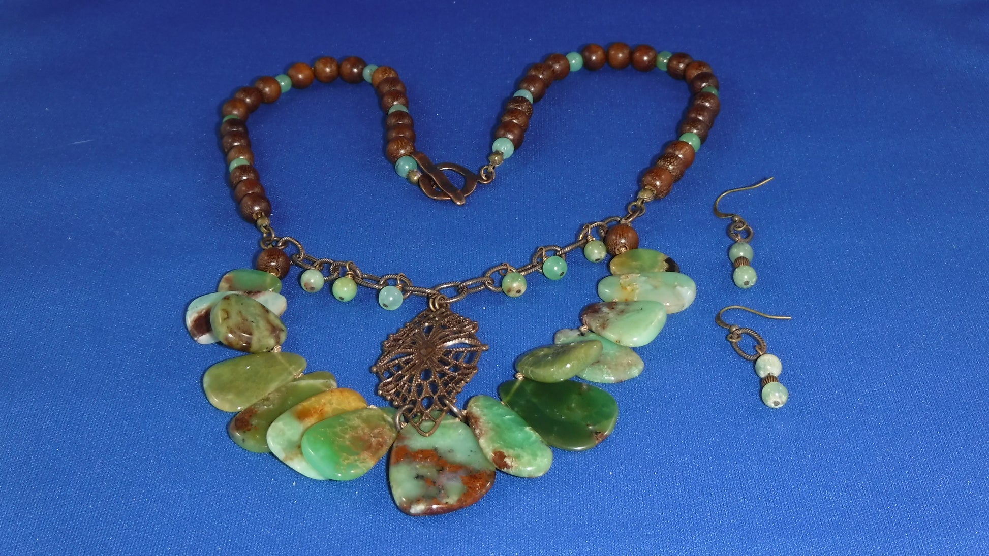 Australian Chrysoprase stones and wood beads with Vintaj brass center and chain (20 1/2") ; Bonus: 1 1/2" long matching earrings with brass-plated earwires included.