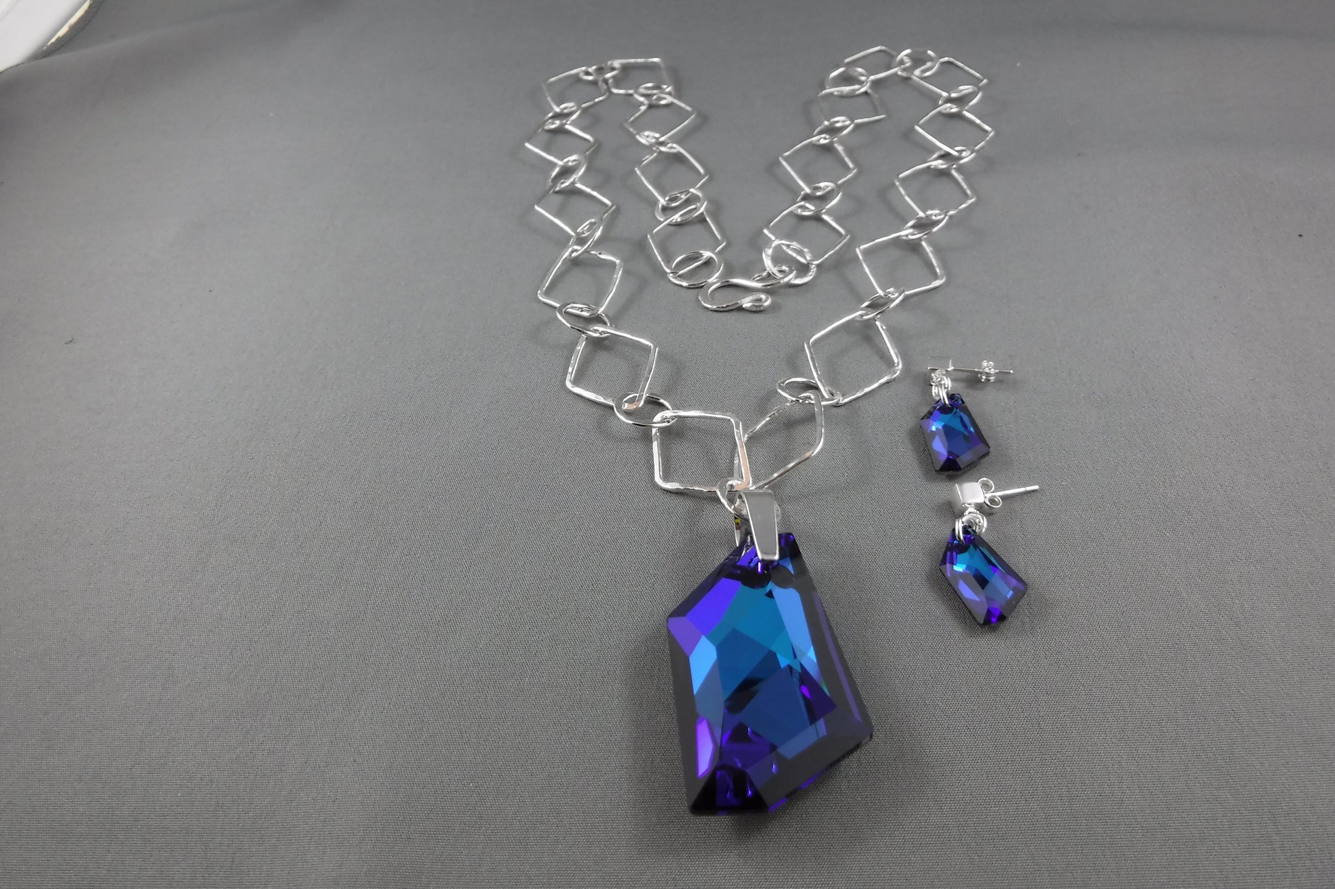 Fine silver handmade chain with large Swarovski crystal pendant (27"); Bonus: Matching earrings with sterling silver studs included (1" long)