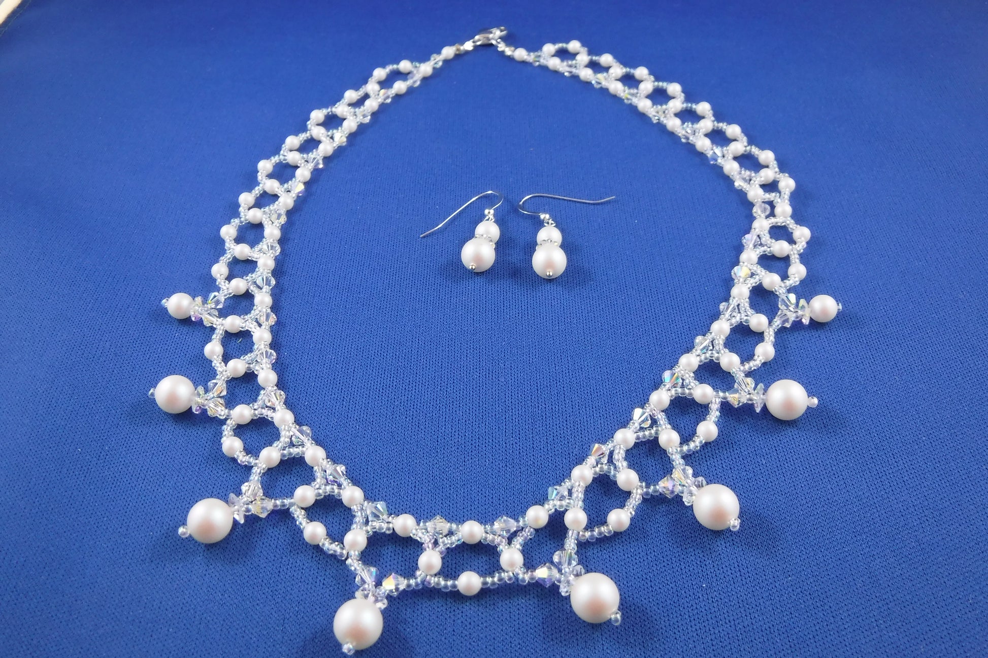 Swarovski pearl and crystal necklace with sterling silver "heart" lobster (19") with matching drop earrings included.(1 1/4"long)