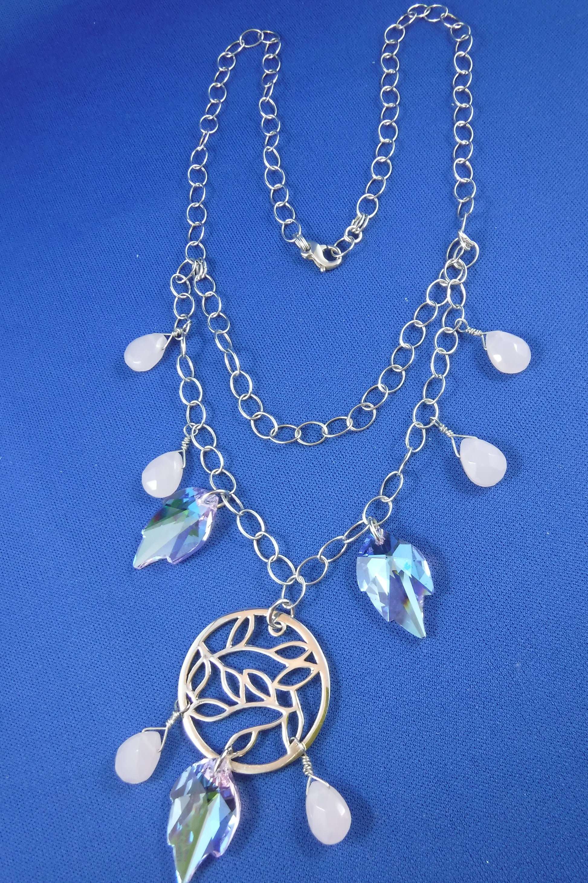 Sterling silver chain with Swarovski crystals, Rose Quartz teardrops and sterling pendant (20 1/2"). See matching drop earrings E-441