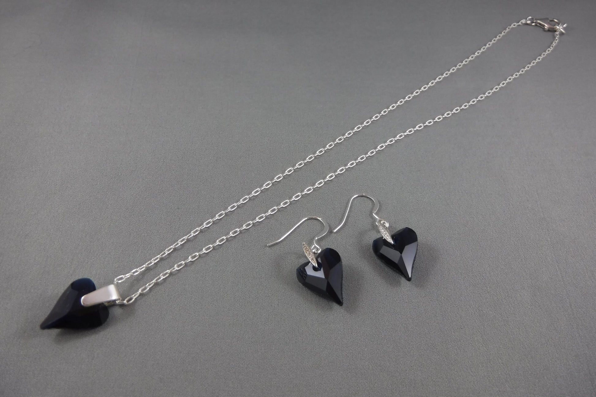 Indigo Blue Swarovski heart-shaped crystal pendant and earrings with Sterling silver bails, chain, lobster closure and earwires (20" chain; heart drops approx. 3/4" long)